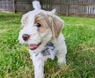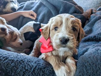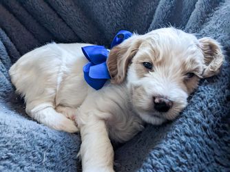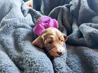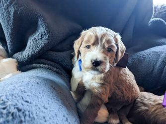 Zuzu is a multigenerational, parti, miniature goldendoodle. Snuggling is her favorite. Although she could cuddle on the couch all day, she never passes up an opportunity to play ball. She is so sweet and gentle, we love our little Zuzu so much!