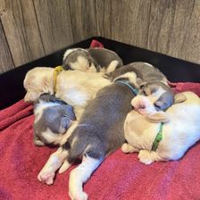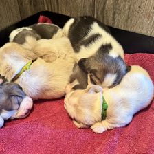 Our Beagle puppies include brown and white, lemon and white, red and white, brown white and tan, black white and tan, and blue tan and white. Russell Terrier puppies include tri-color, white, white and tan, and white and black. Colors will vary depending on the parent dogs.