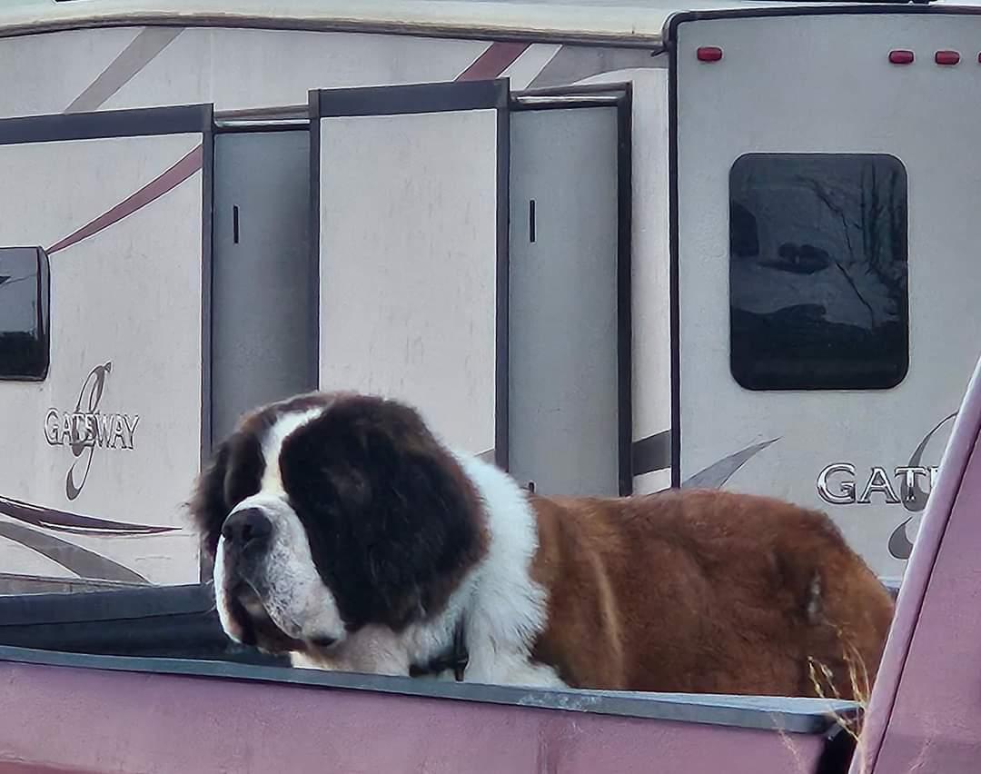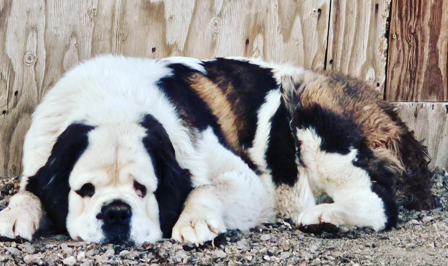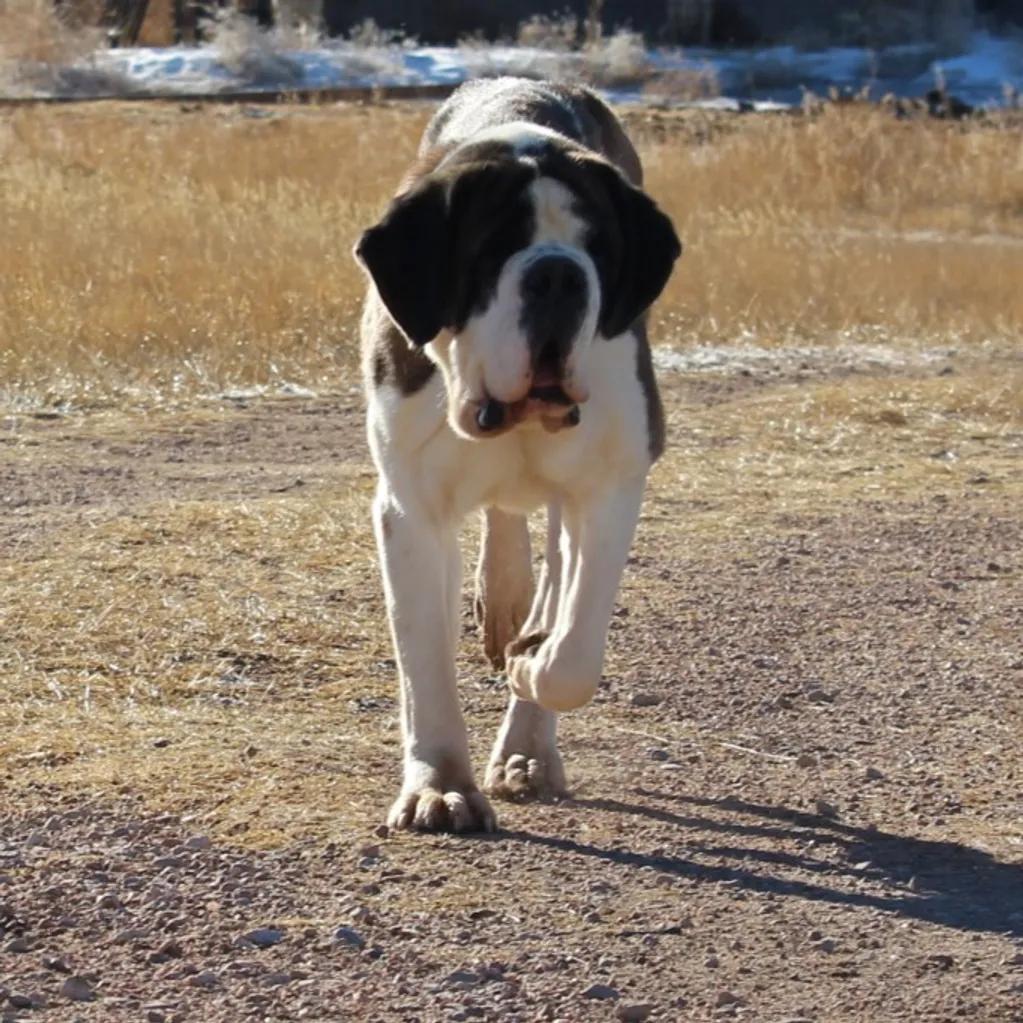 Creed was born here at Mountain Valley Saint Bernards and has been on the go since birth and has has a tremendous following since coming back to us. Unfortunately Creed's show career abruptly ended after her run in with a mountain lion however in my opinion this certainly is not a deal breaker as she brings so many qualities to our program and the breed overall! Creed is a phenomenal working girl and does NOT slow down one bit! She defines work ethic and drive every single day and we are always blown away by this gal. All of her babies have exceptional temperaments and are beyond gorgeous. With Creed's side of genetics, I will say that her offspring do mature slowly which is a bonus in many aspects, however keep this in mind when you are looking for a show prospect puppy.