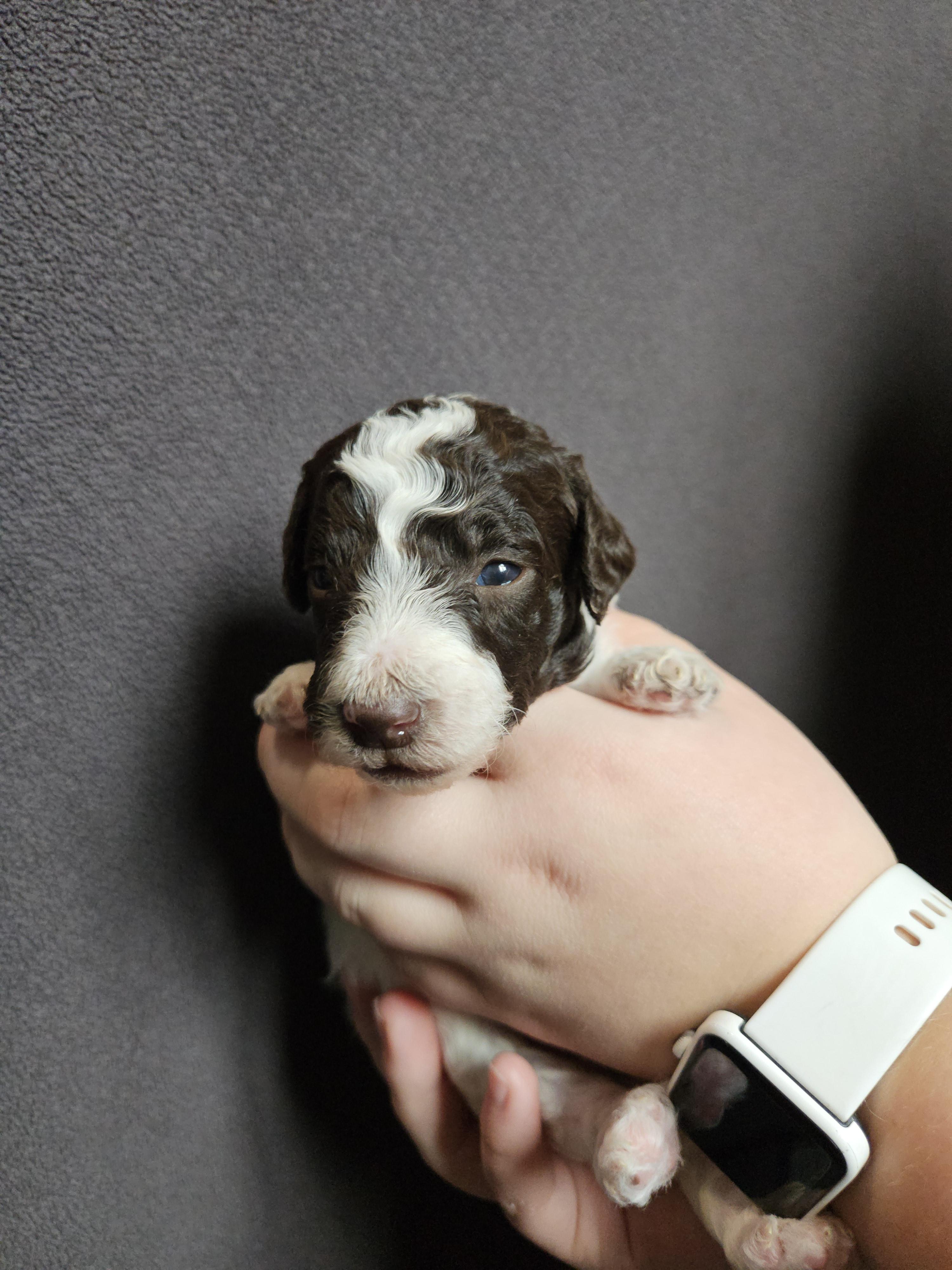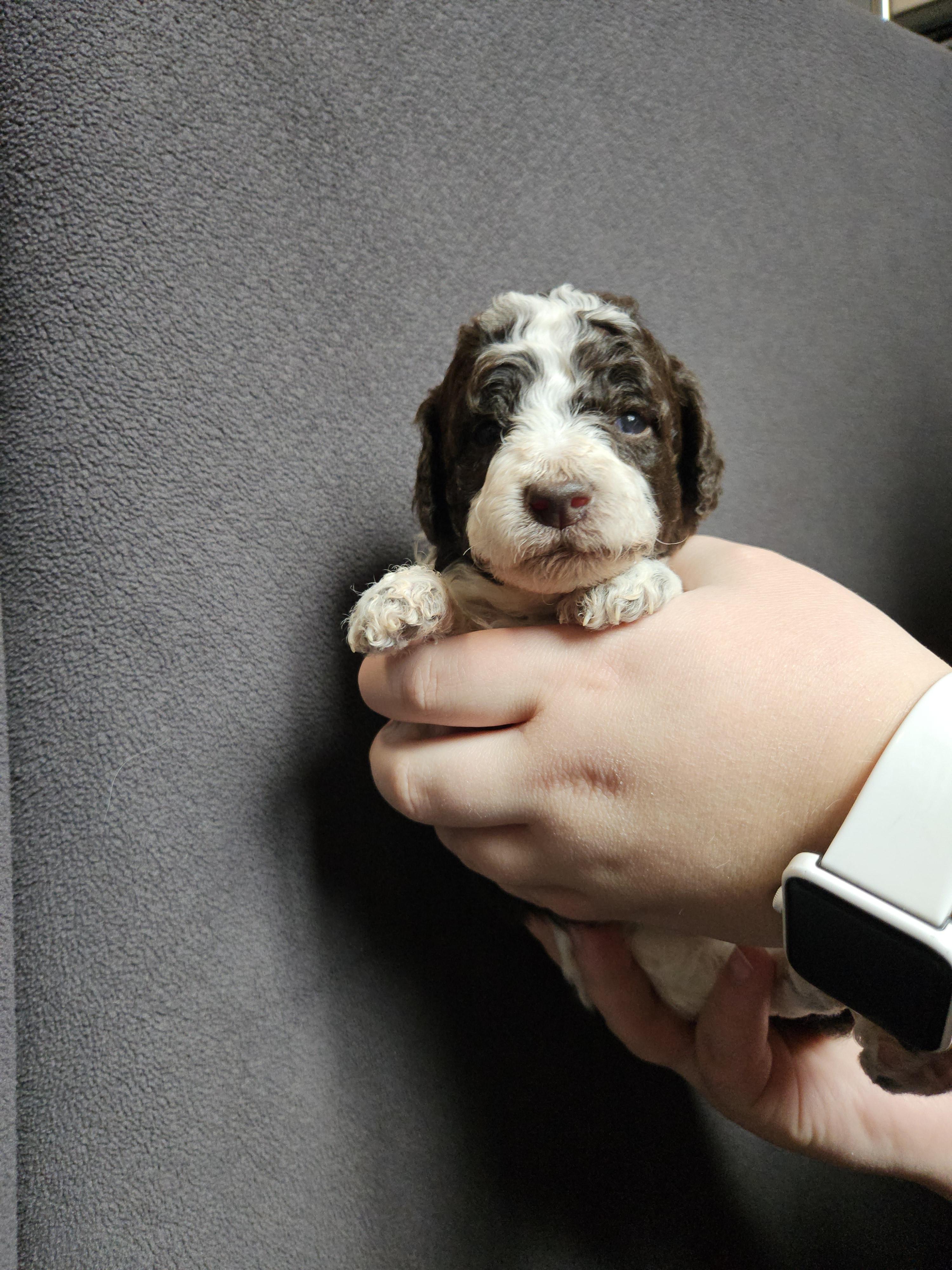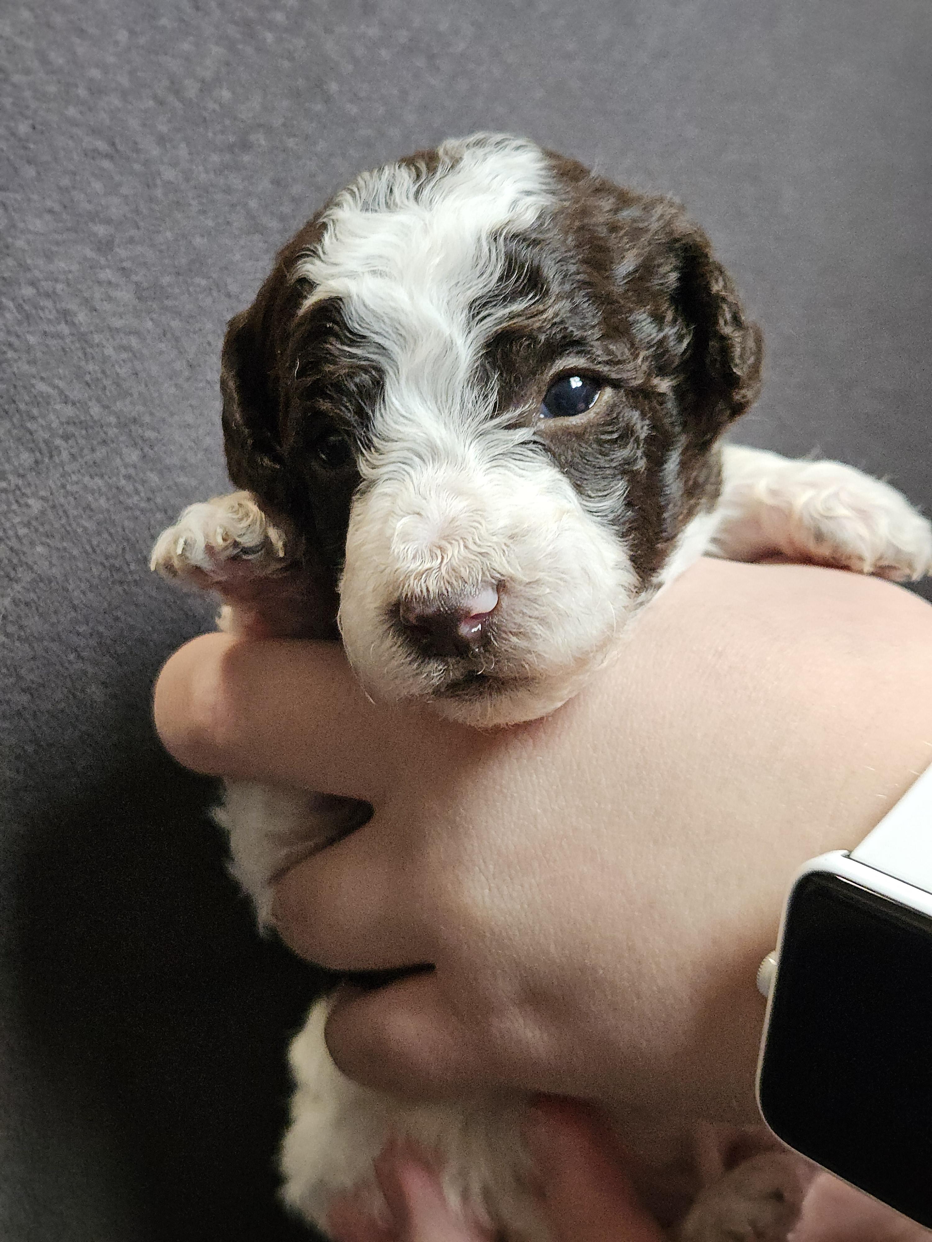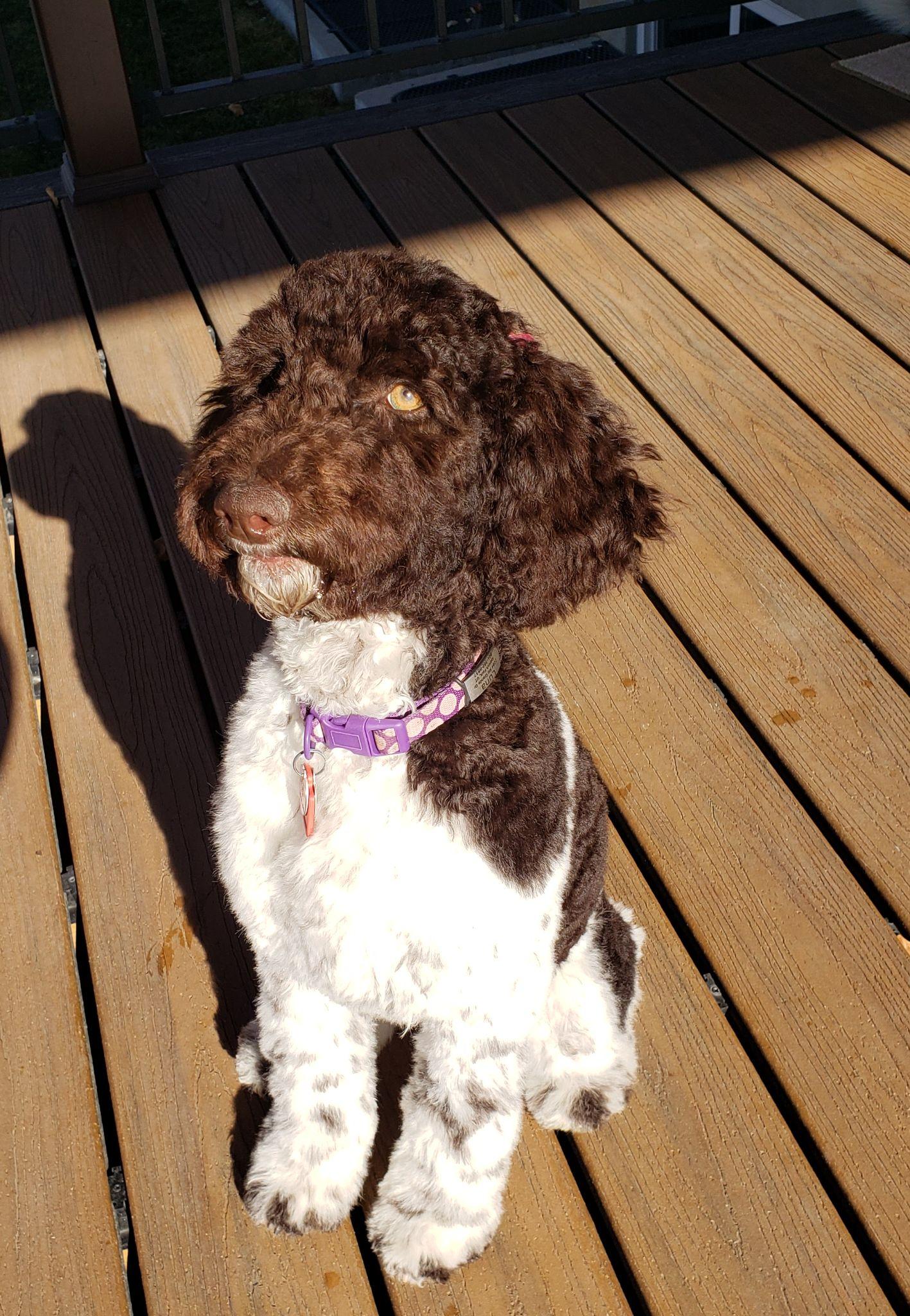 Luna is a brown and white parti poodle. She is gentle and quiet. She loves to ride in the car and go fishing and camping.