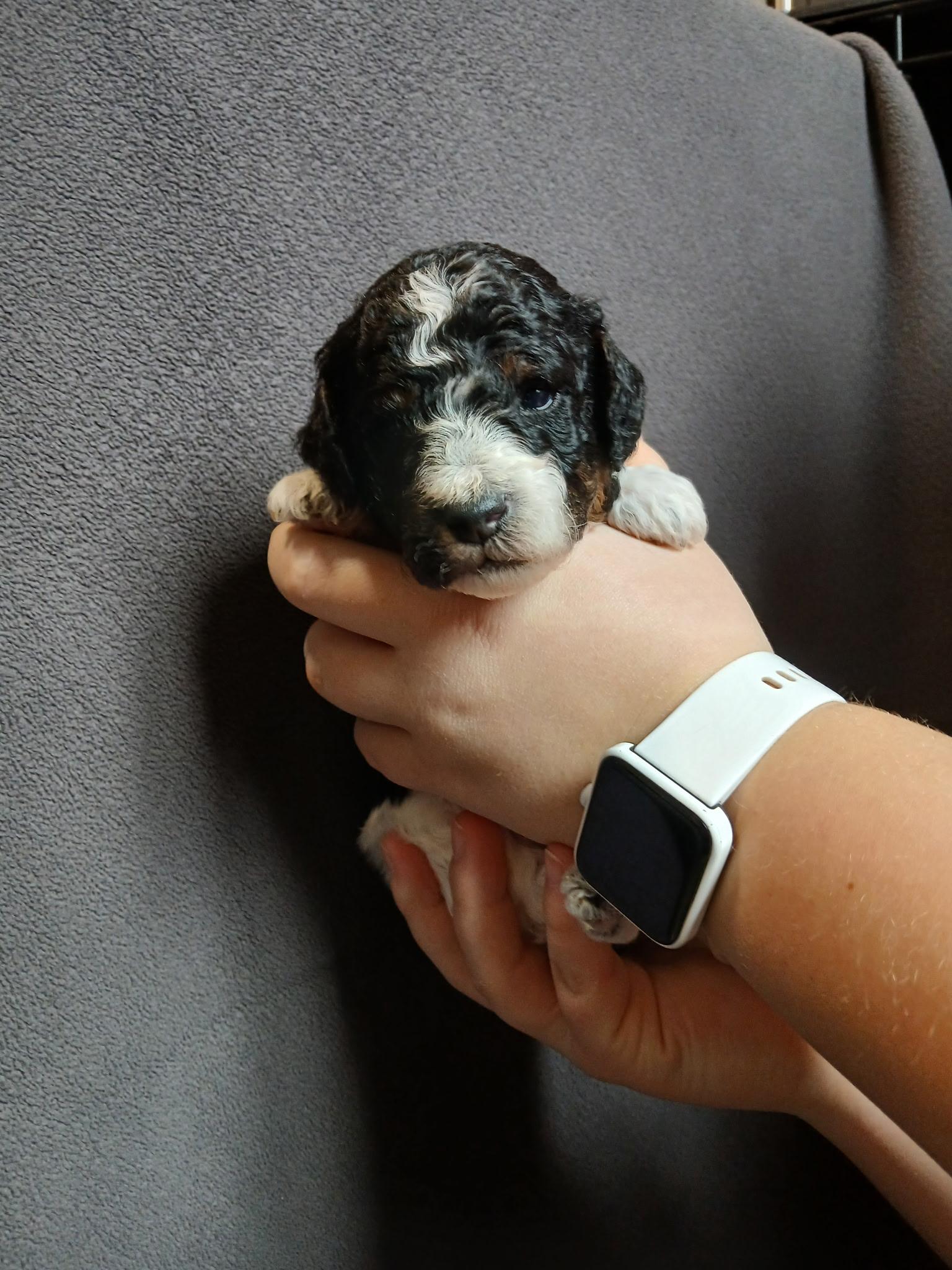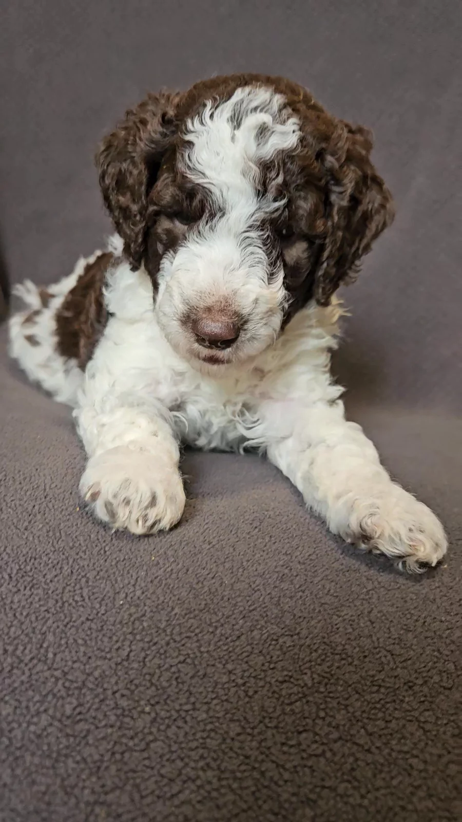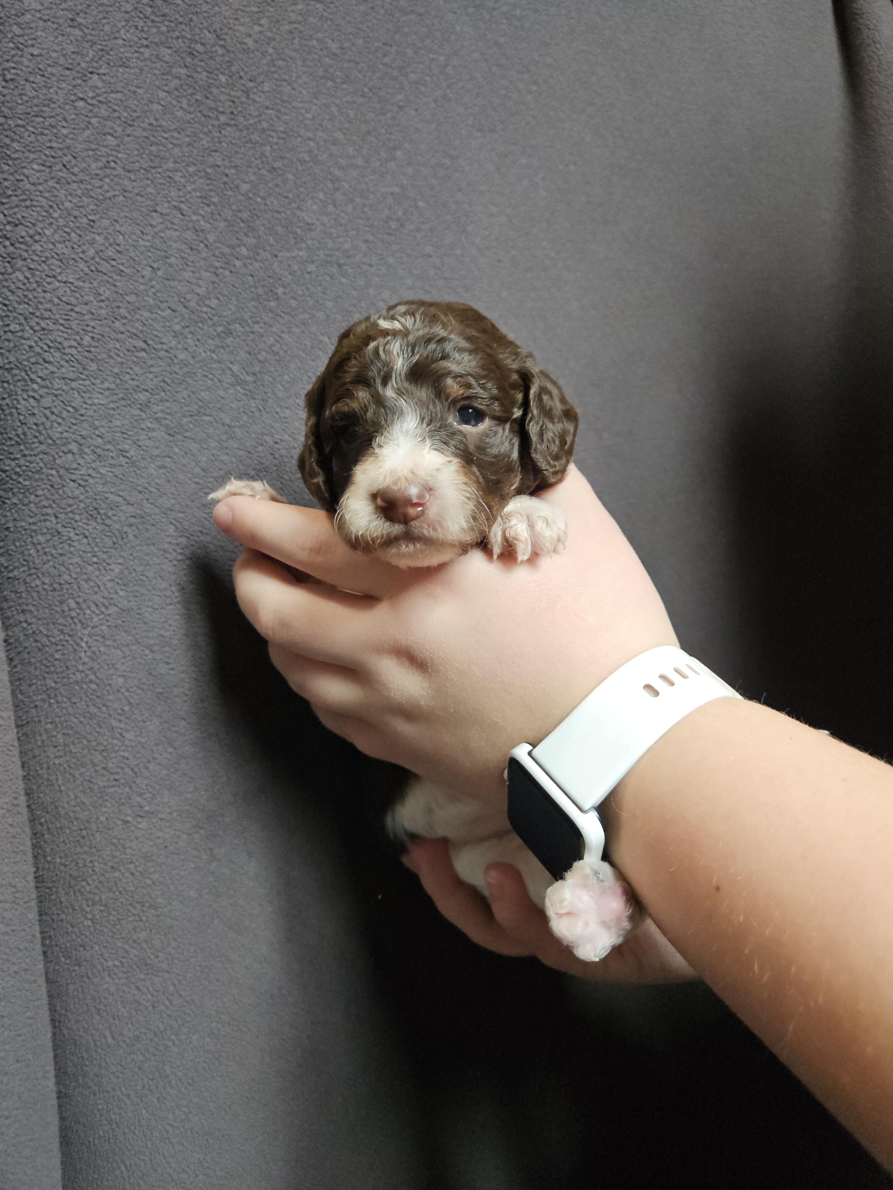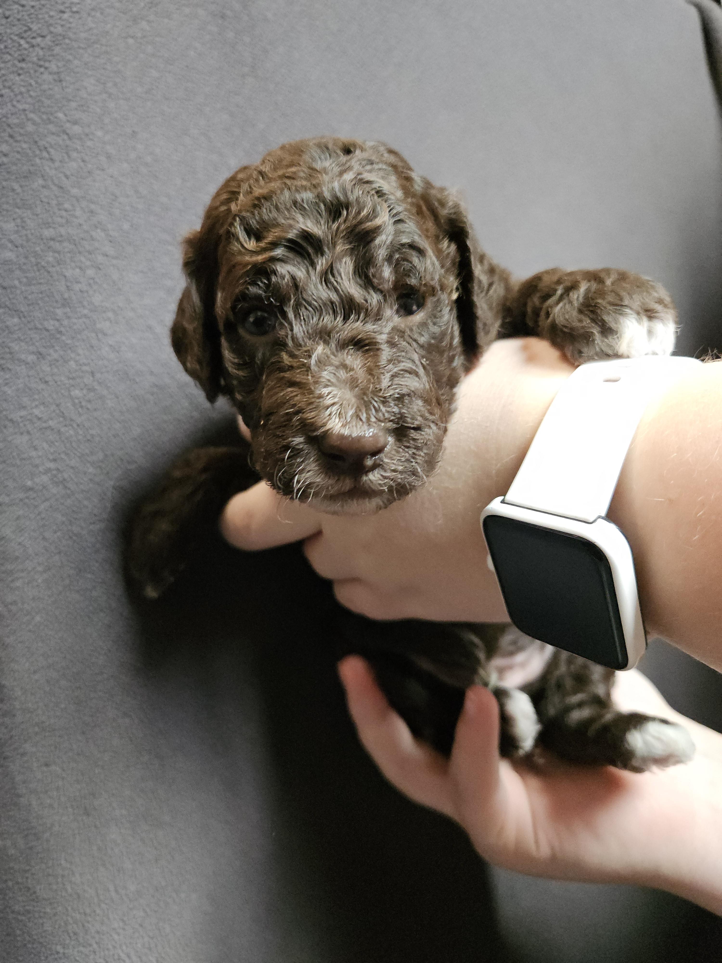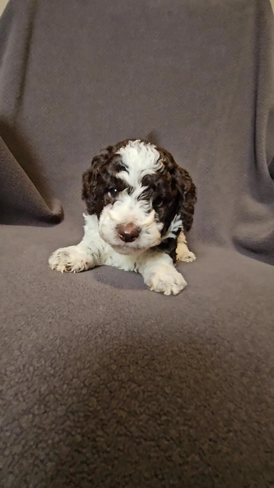 Luna is a brown and white parti poodle. She is gentle and quiet. She loves to ride in the car and go fishing and camping.