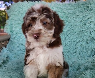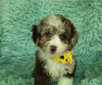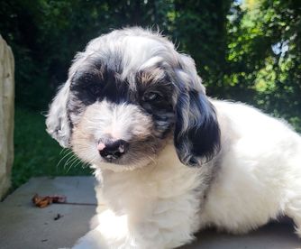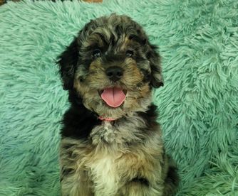 Our Bernedoodle puppies include brown and white, brown, phantom, and blue merle. Goldendoodle puppies include phantom, merle, and parti. Colors will vary depending on the parent dogs.