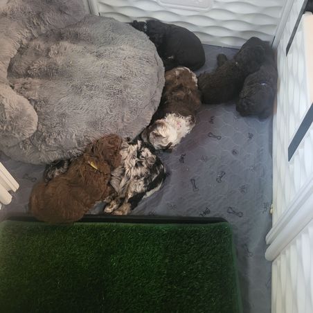 I’m home full time, so each puppy gets daily hands-on care and socialization. They’re raised in our living room, started on ENS, exposed to new scents and sounds, and begin potty training early. In their final weeks, they enjoy supervised time exploring the house. All puppies receive proper vet care and lots of love.