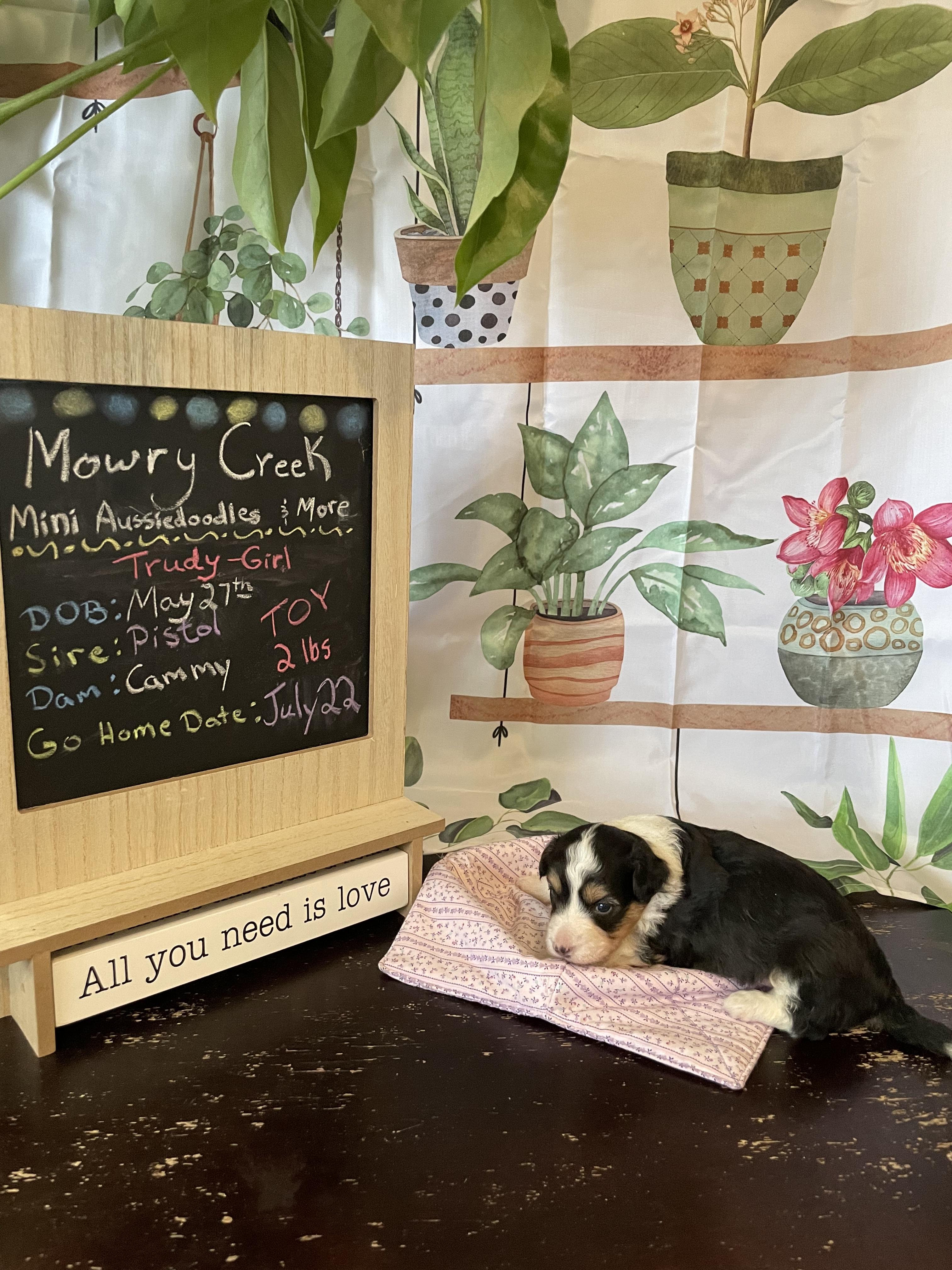 Aussiedoodle puppies are mini size. Poodle puppies include toy and miniature sizes. Miniature Australian Shepherd puppies include tiny and miniature sizes. Sizes will vary depending on the parent dogs.