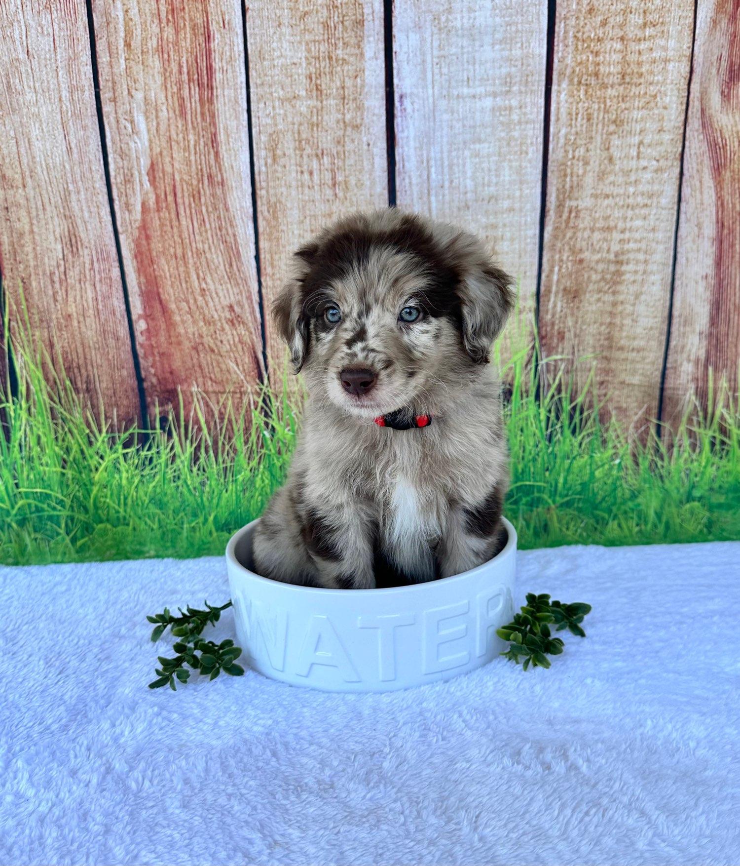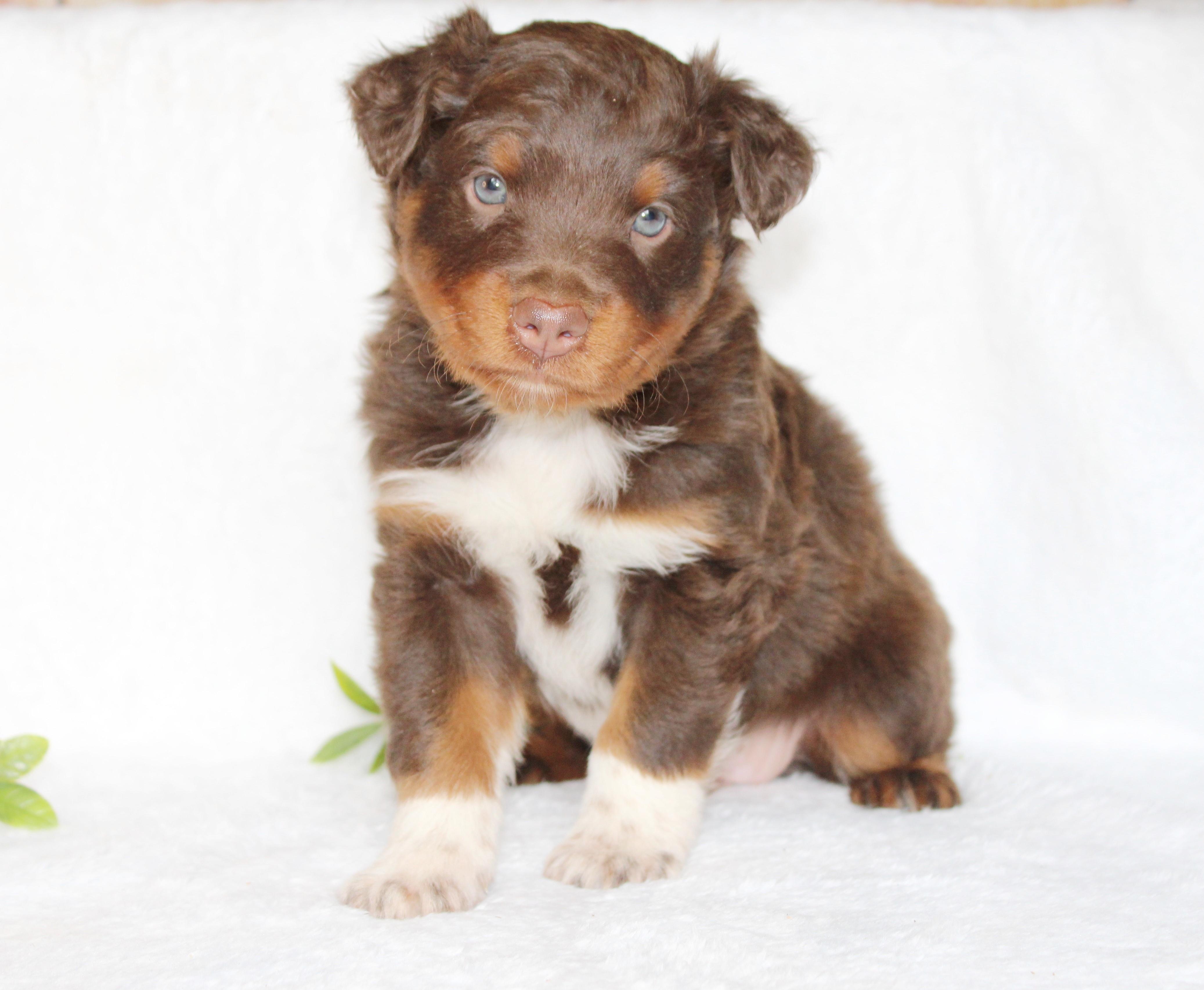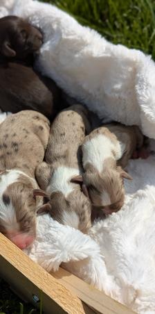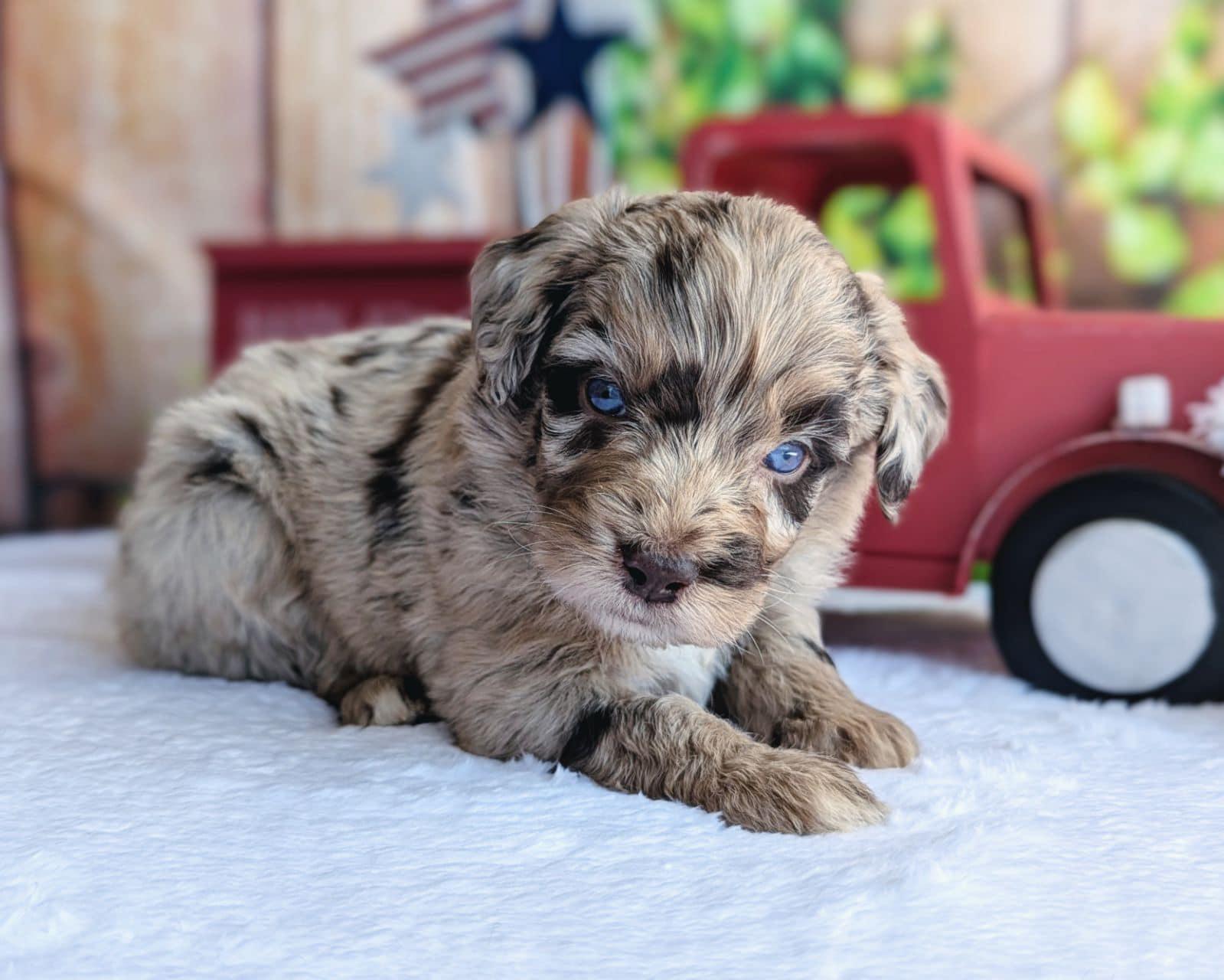 Our Aussiedoodle puppies include brown and white, blue merle, and red merle. Australian Shepherd puppies include red merle, blue merle, black tri-color, and red tri-color. Colors will vary depending on the parent dogs.