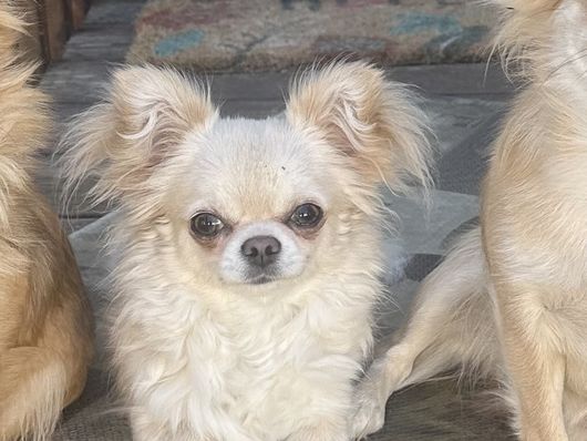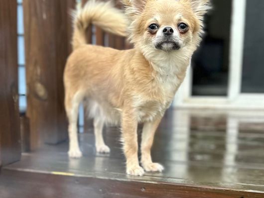 Brown and tan long haired Apple head Chihuahua that has a wonderful temperament.