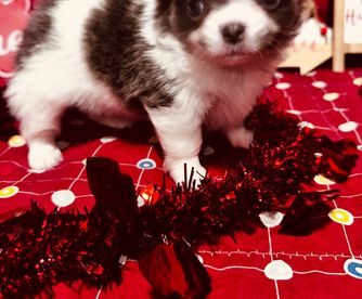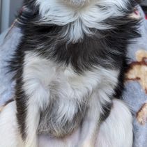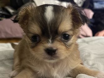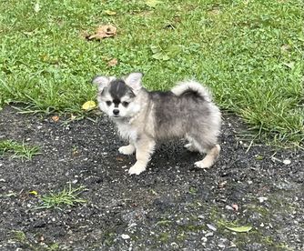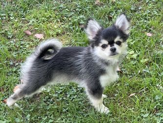 She is a husky marked chihuahua. She has a cream under coat with long back tips on her coat. She has white markings and cream points as well
