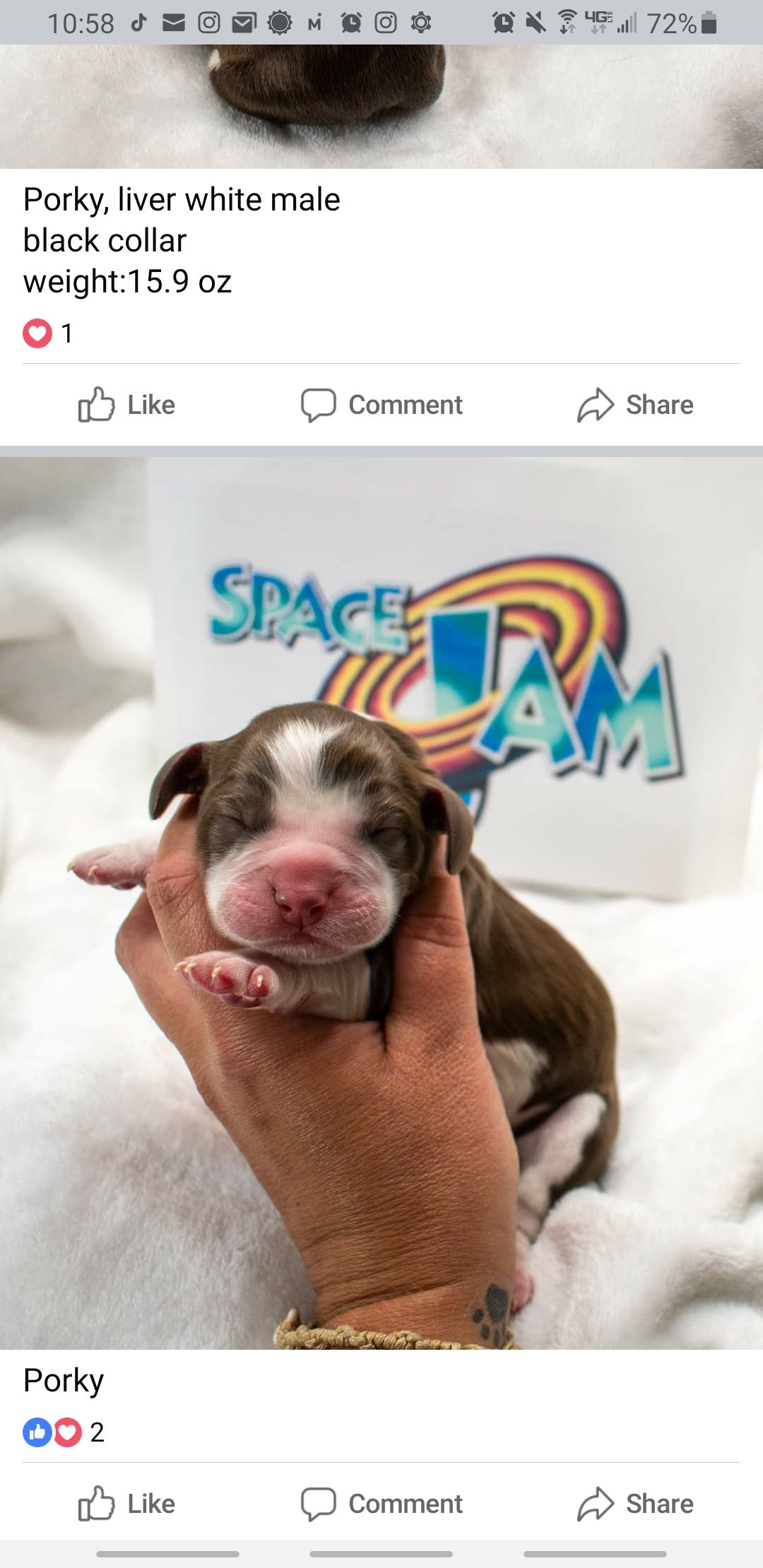 “This price also includes tail docking, dewclaw removal, limited (pet home only) AKC registration, the first round of shots, a health check given by our vet, and a puppy pack. All of our puppies are at the same price regardless of color or gender. Each puppy is $900 total of that $200 is the deposit.”