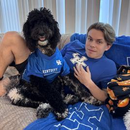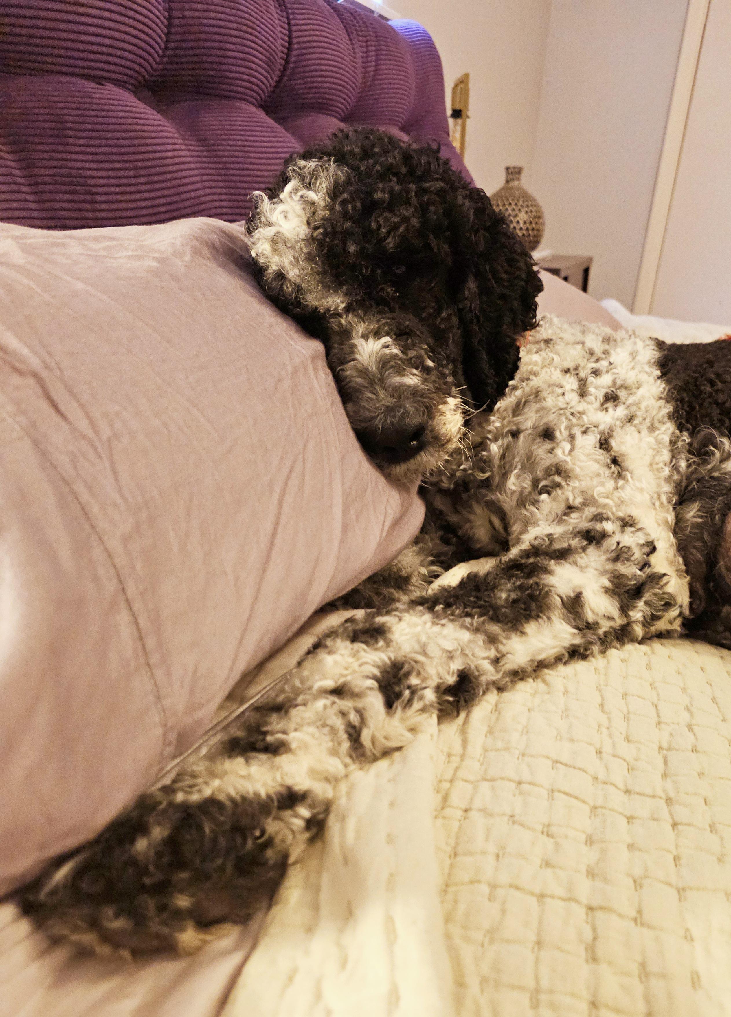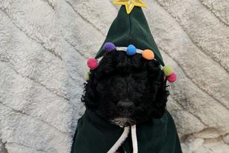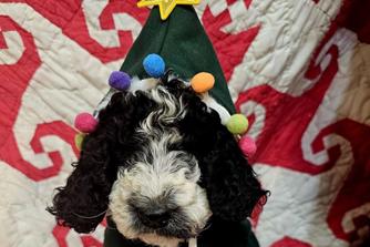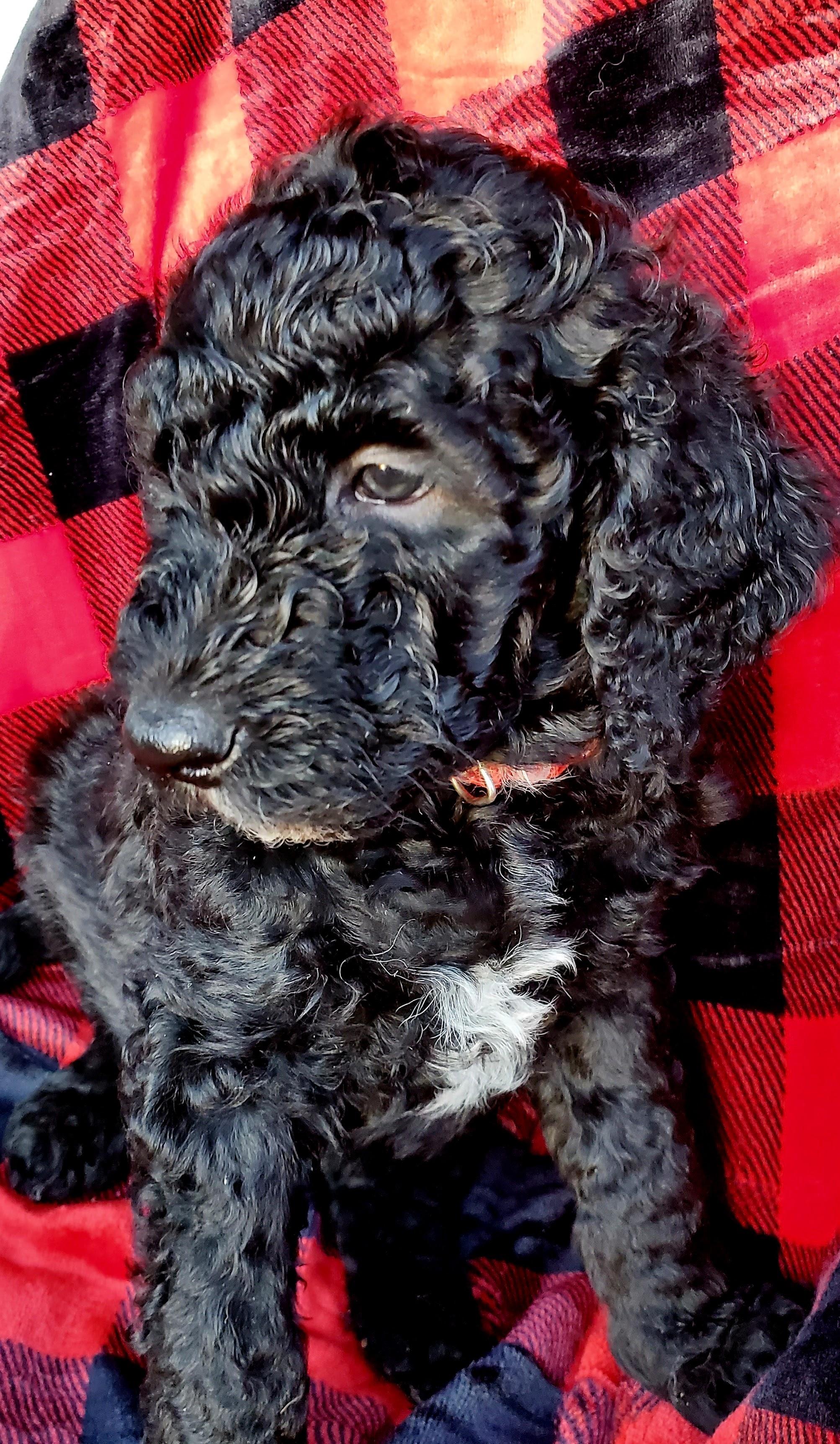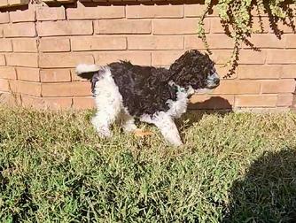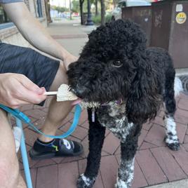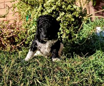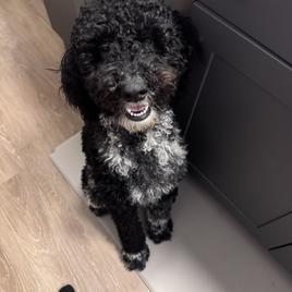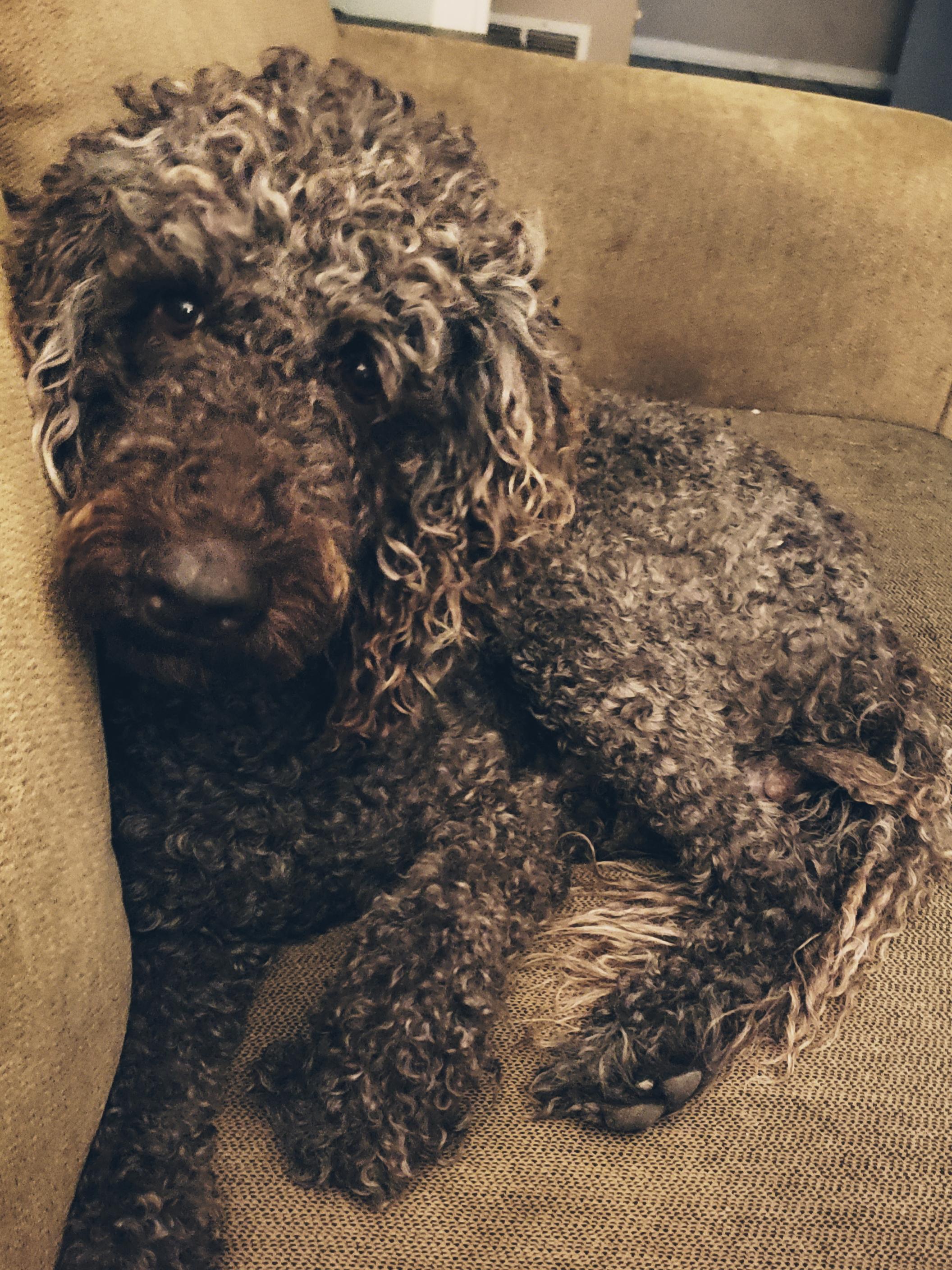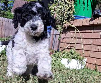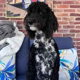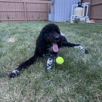 Buddy is an avid ball player, as long as I throw he'll fetch. He's extremely intuitive, loyal, and affectionate. Don't tell the girls but he's my favorite! He has a curly fleece coat that's non-shedding. He loves water and is very agile. A funny thing he does is he likes to keep all his tennis balls in his food bowl. At times I have to put them back in the toy box in order to feed him.