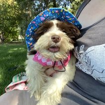 Heidi is AKC registered. She is a mega-coated liver and white parti. She is very vocal and loves to talk to you all the time. She loves water and often takes a swim in her puppy pool.