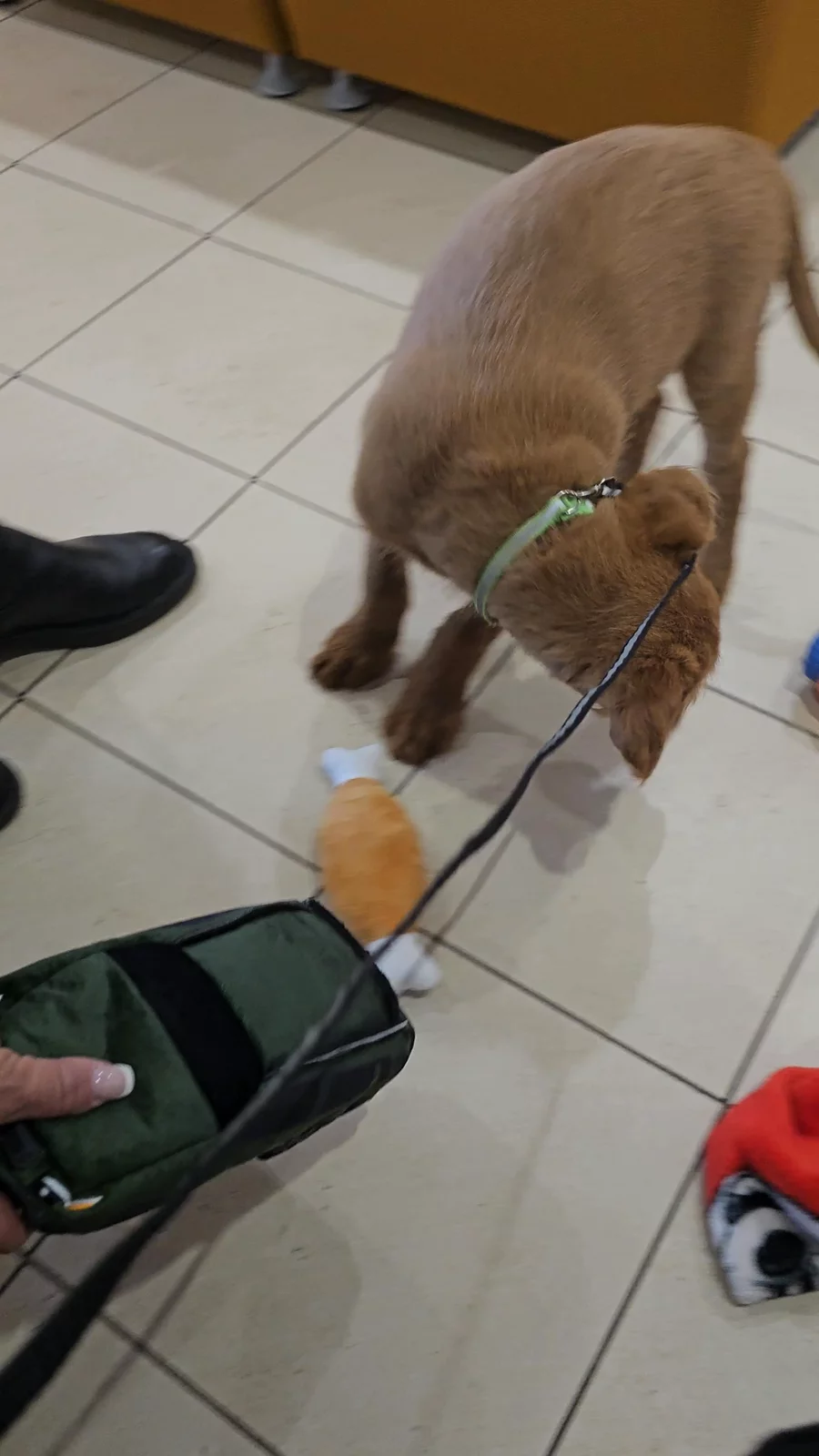 When you are socializing puppies and your vehicle springs a serious oil leak, you use the opportunity. Chewie had an amazing time at the Toyota / Subaru dealership. We were on the Toyota side, but news of a cute puppy travels fast! An employee from the Subaru side brought him 2 toys: a Subaru with a water bottle toy hidden inside! He did an amazing job and made a ton of new friends.
