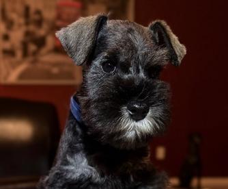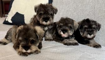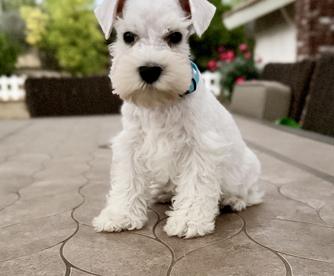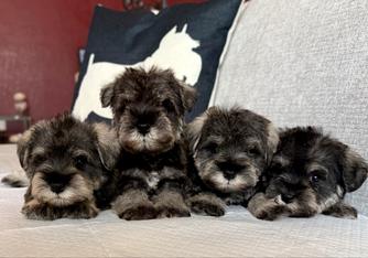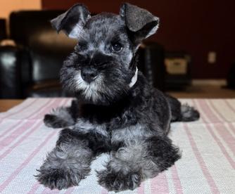 Our Giant Schnauzer puppies are black. Miniature Schnauzer puppies include white, salt and pepper, black and silver, and black. Colors will vary depending on the parent dogs.