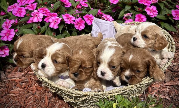 Our puppies include blenheim, ruby, and tri-color. Colors will vary depending on the parent dogs.