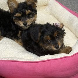 Our Morkie puppies include black & tan tri-color and white and tan. Yorkshire Terrier puppies include chocolate and tan, chocolate, tan and white, and black and tan. Colors will vary depending on the parent dogs.