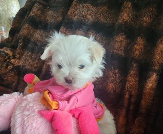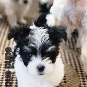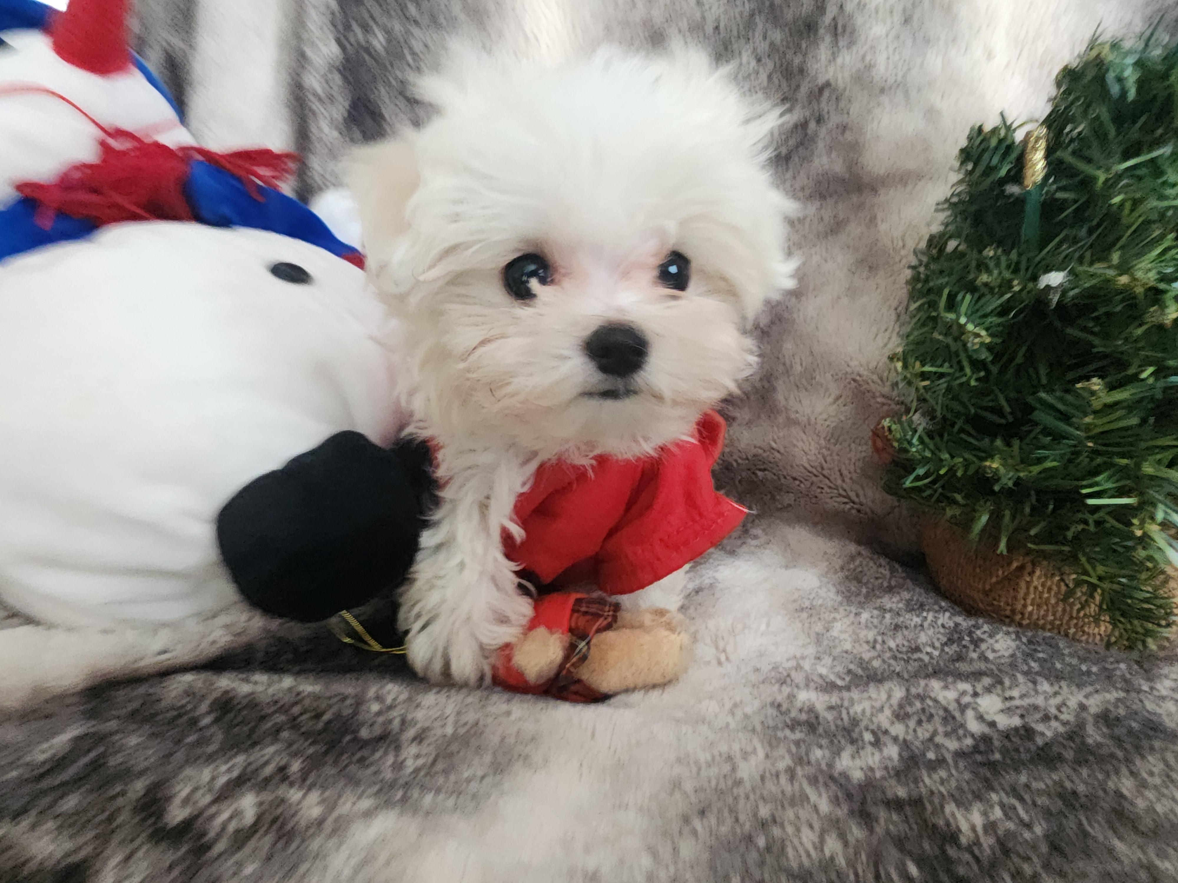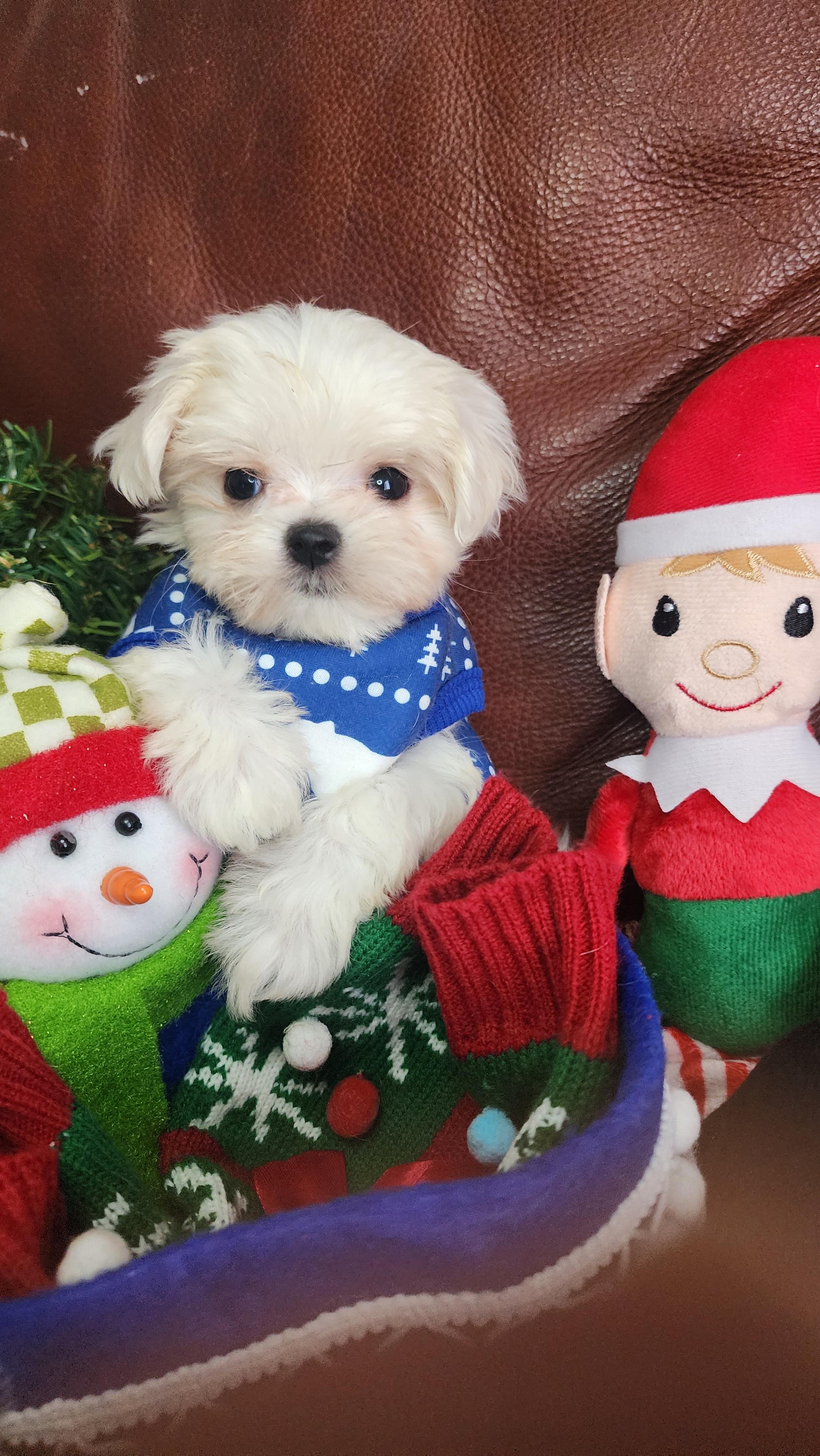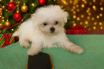 Our Maltese puppies are white. Morkie puppies are black & tan tri-color. Maltipoo puppies include black & white and black & tan tri-color. Colors will vary depending on the parent dogs.