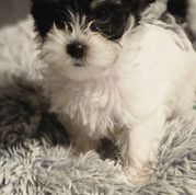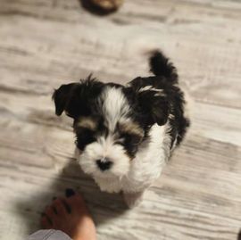 Hi! Happy holidays! I only have one of these beautiful Parti morkies left! Bailey is a beautiful tri color male charting between 6 to 7 pounds. He has had his shots and is ready now for his new family!