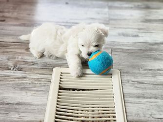 The pups are 6 weeks old now. They are learning to use the pee pad regularly and come when called. They are highly socialized and very sweet. Harper is just a very snuggling, loving boy.