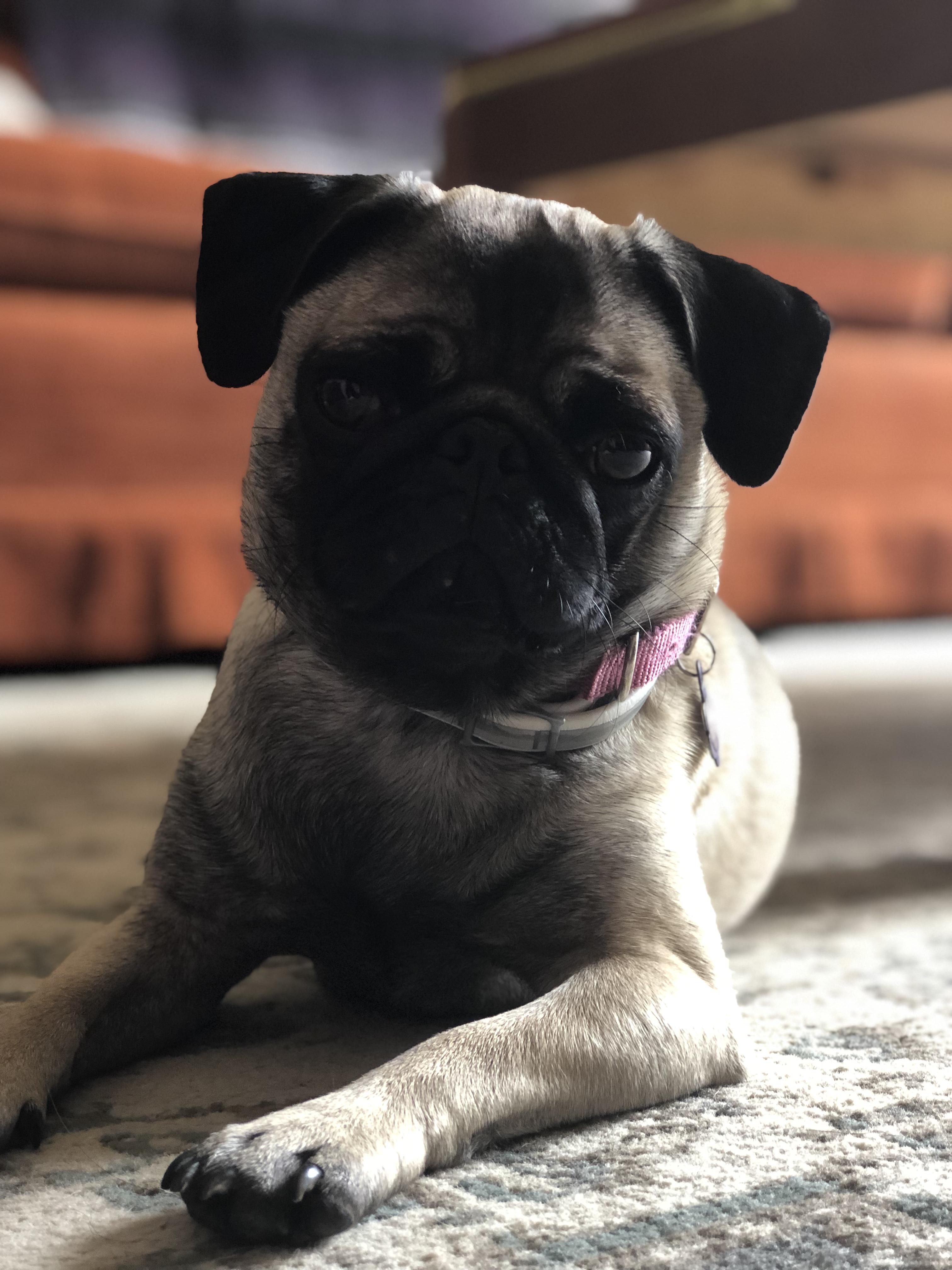 Quinn is a female Pug. Carefully selected as a great representative of her breed, Natalie decided to make her part of their program. Natalie has passed Good Dog’s screening process, which involved a review of their breeding practices, environment, and the mental and physical health of their dogs.