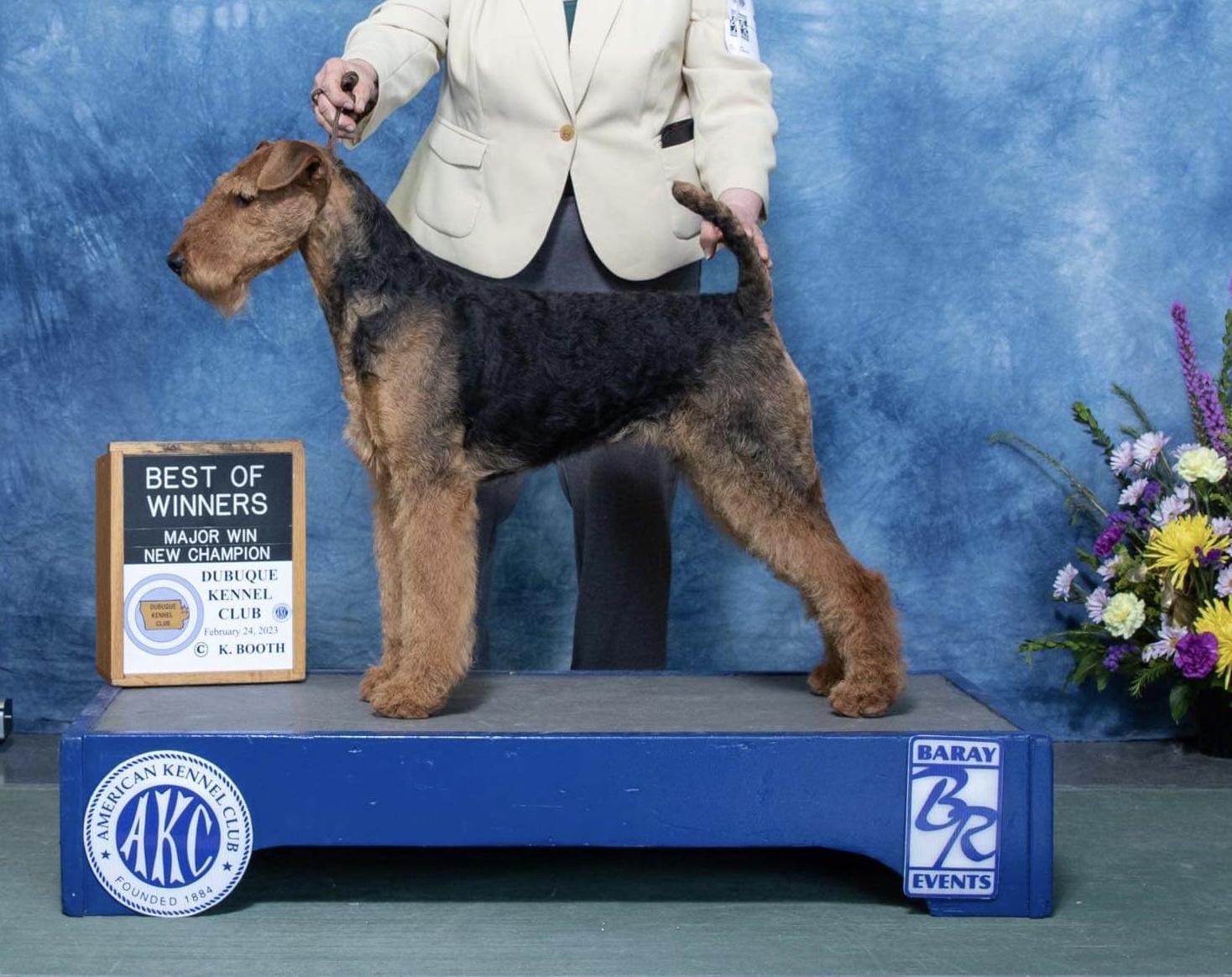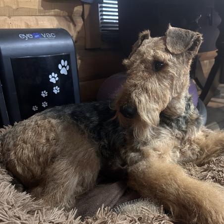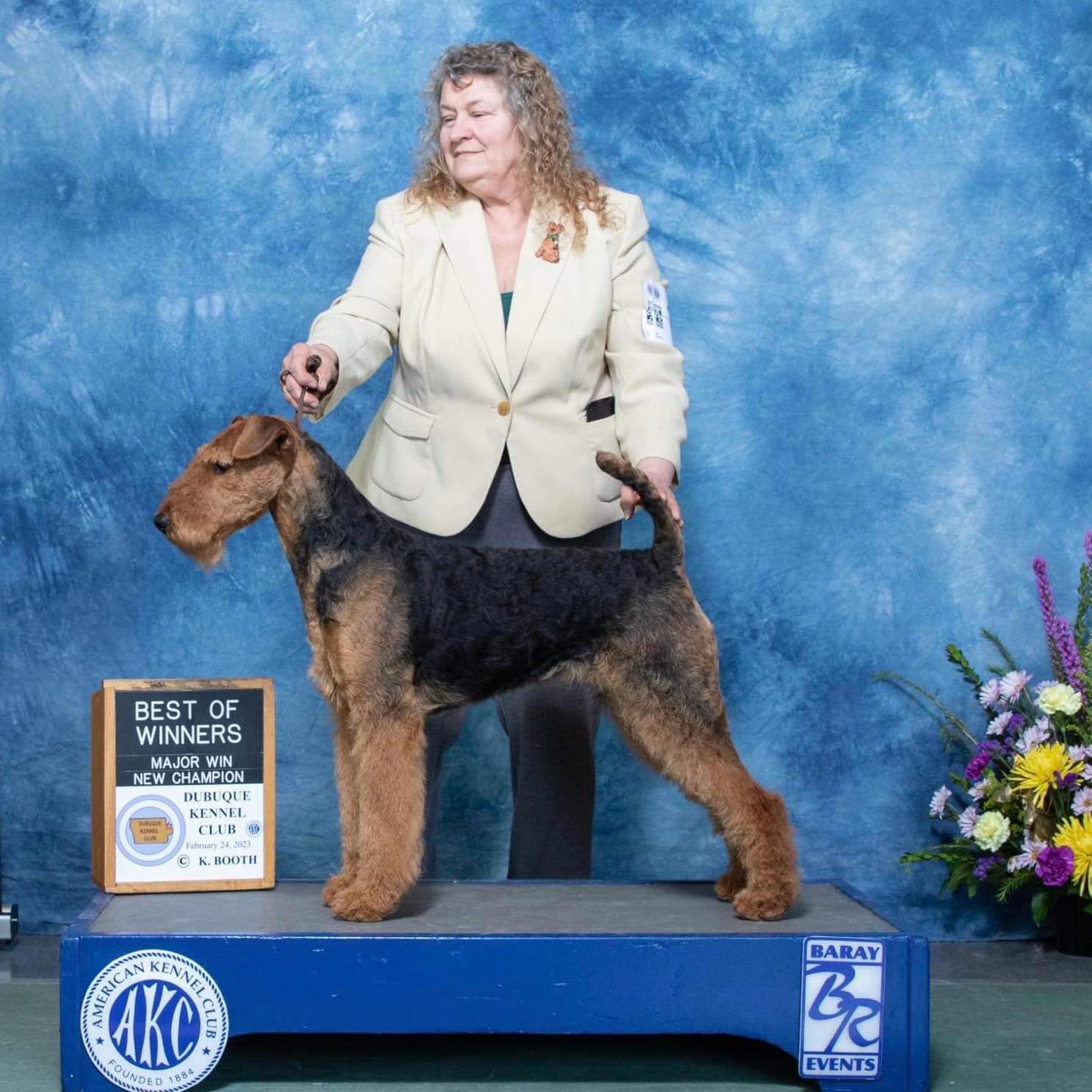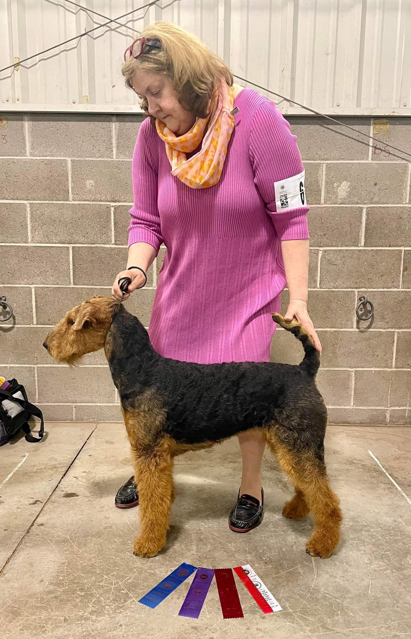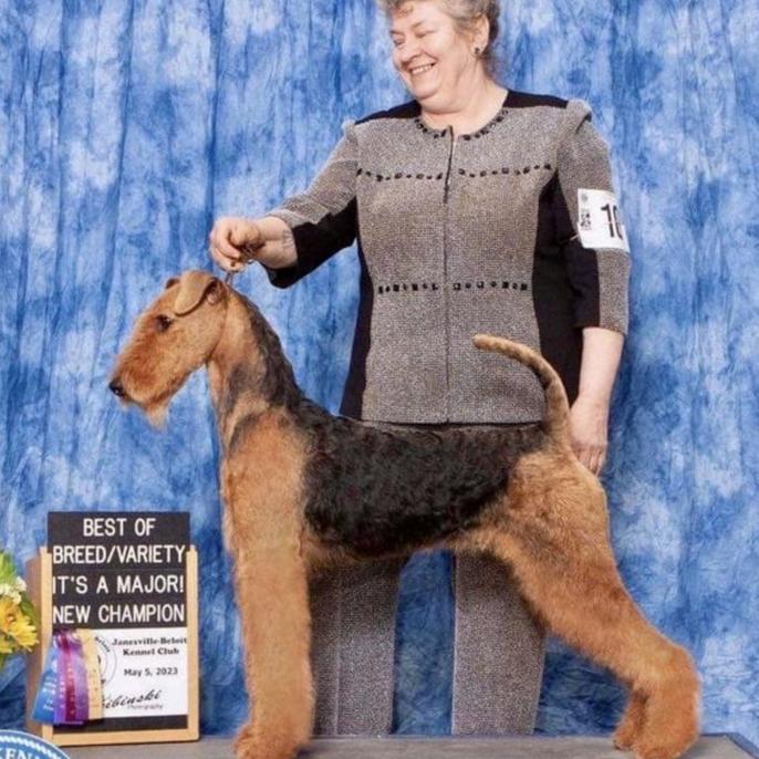 I'm Rita G., the breeder behind Mystic’s Airedales located in Lodi, WI. Our dogs are bred to AKC Airedale standards, health and temperament. We are OFA CHIC Certified. I test for Hips, Elbows, Thyroid, Eyes, Heart and Kidneys, through the OFA, Canine Health Information Center We go above breed suggested health testing. We are dedicated to providing wonderful healthy pups to our forever family’s. We do everything we can to provide you with a great puppy. We practice Puppy Culture protocols. We love these dogs so much and know you will love them too! Airedale’s are very versatile! We do multiple AKC Events, including Conformation, Fast Cat, Coursing Ability, Barn Hunt, Obedience, Rally, Agility, Tricks, and Temperament! Maylin is a Certified Therapy Dog and has received Airedale Terrier Breed Club Versatile Awards!