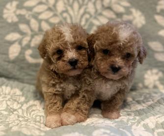 Labradoodle puppies include caramel cream, caramel, and caramel red. Poodle puppies include apricot, black, blue, red, and parti. Colors will vary depending on the parent dogs.