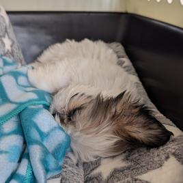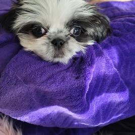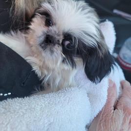 Diamond is a lovely Shih Tzu with a silky coat of soft, cream-colored fur that shimmers in the light. Her large, expressive eyes always seem to hold a serene and thoughtful gaze, reflecting her calm and relaxed nature. Diamond has a tranquil presence, often found nestled in her favorite cozy spot, whether it's a plush cushion or right by your side.