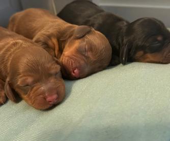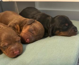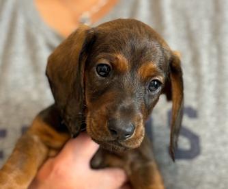 Our puppies include red, chocolate and tan, and black and tan. Colors will vary depending on the parent dogs.