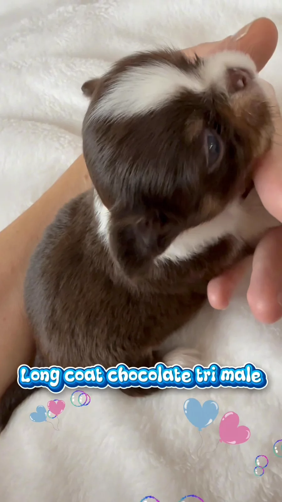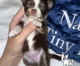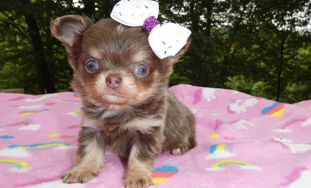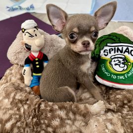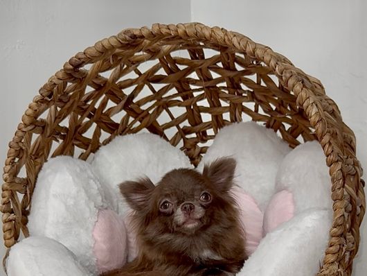 Tiny little Bennett is our 3 pound AKC Russian import. He's a gorgeous chocolate, double long coat. He has a huge apple head, extreme baby doll face! He's health tested and cleared