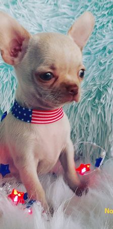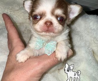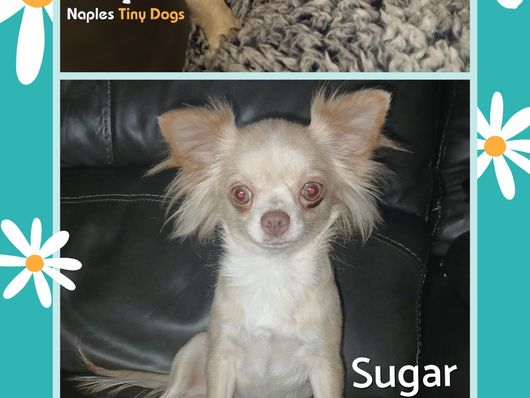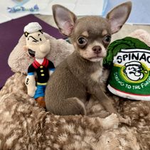 Sugar is our gorgeous AKC lilac cream applehead Chihuahua. She has a gorgeous double long coat. She is health tested and cleared 6lbs