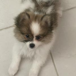 Keeva is a beautiful chocolate and white Purebred Pomeranian.