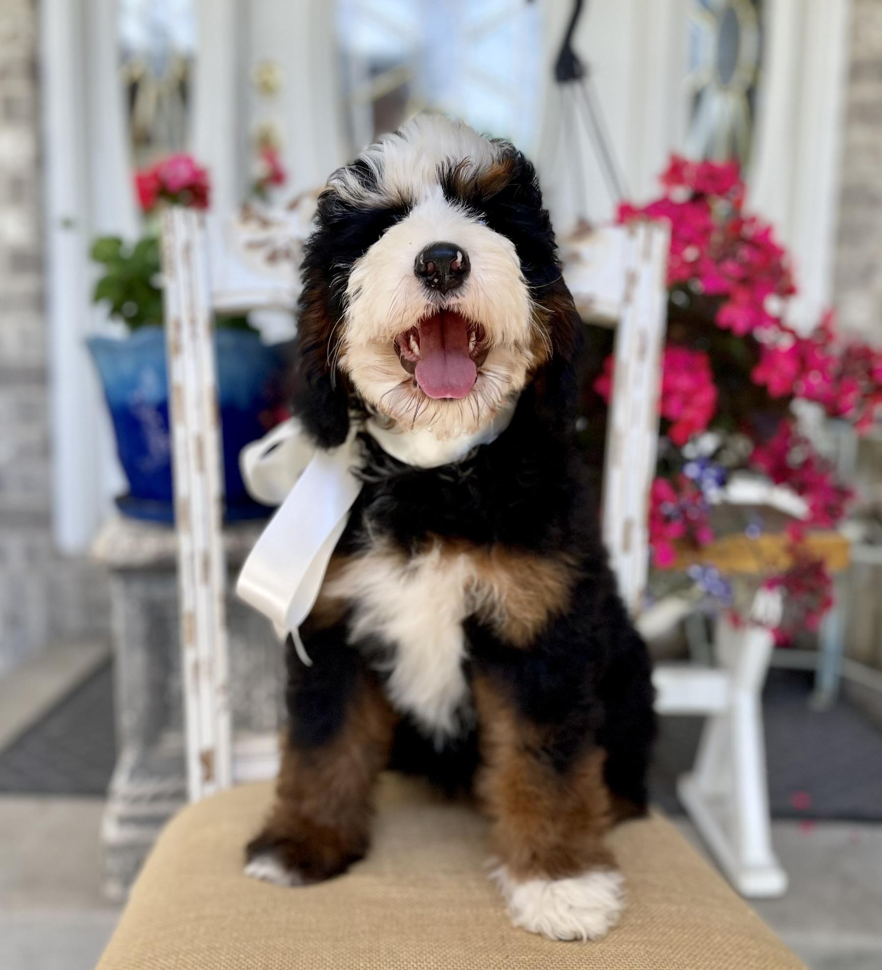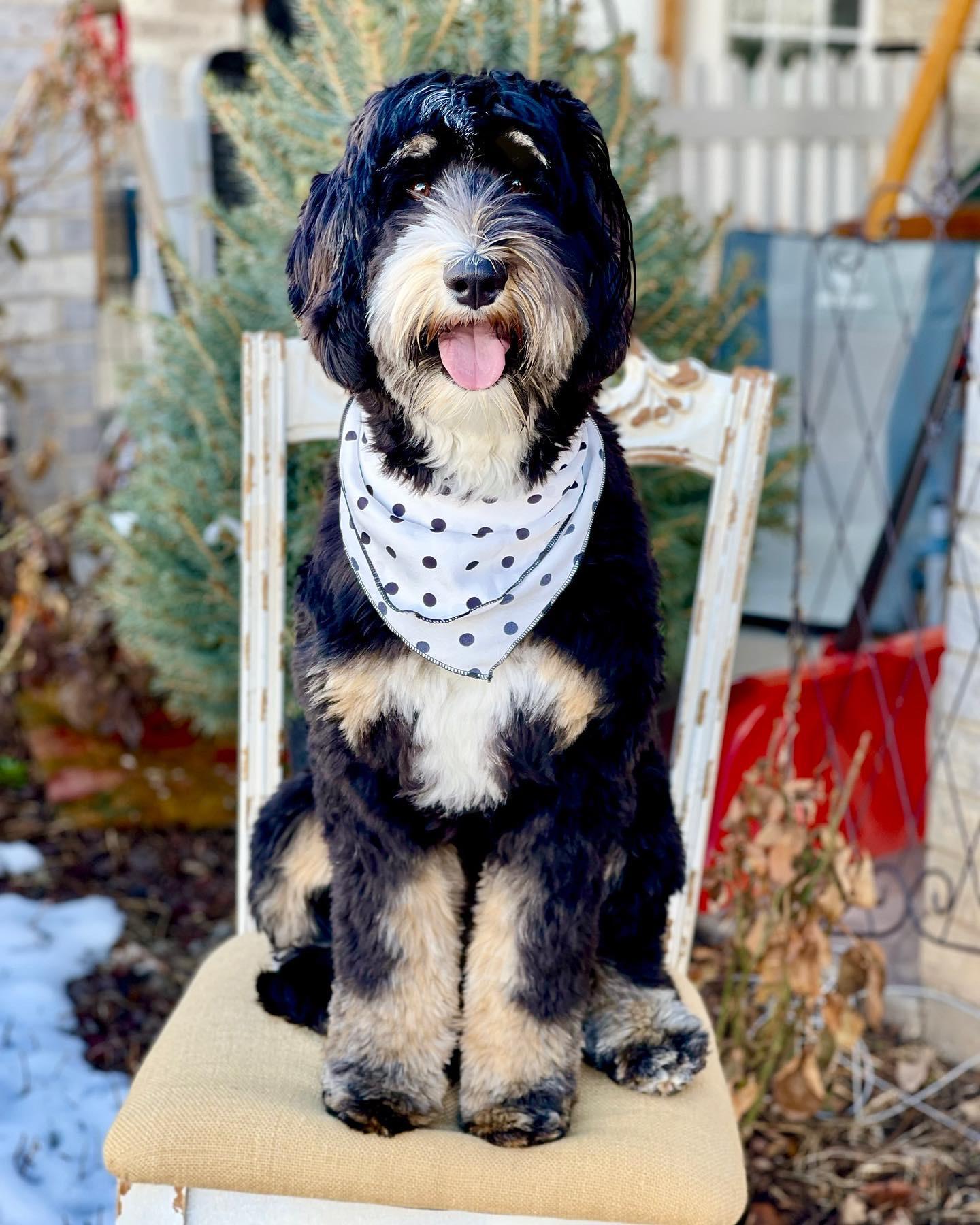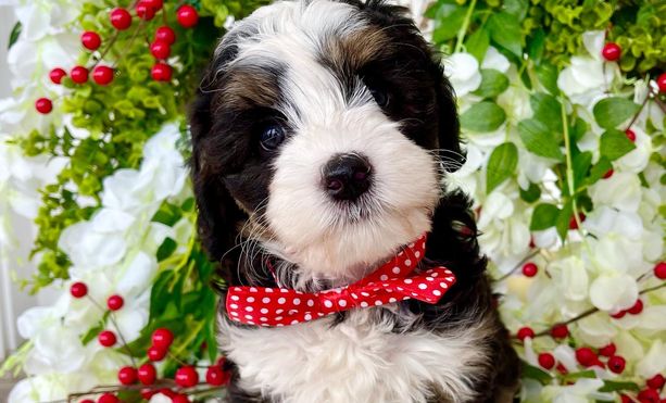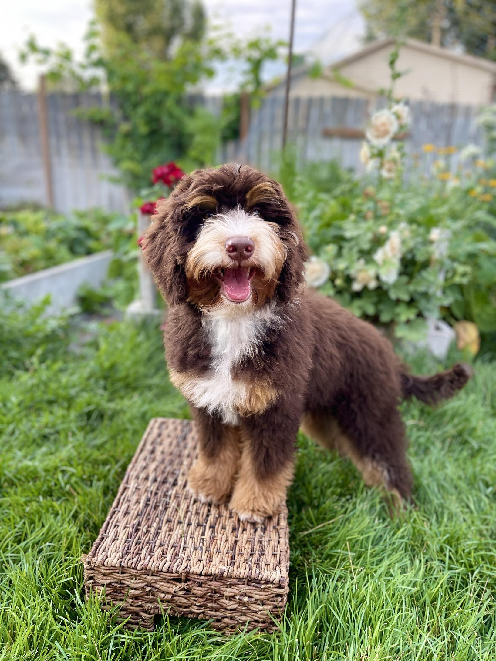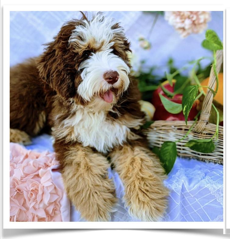 Our Goldendoodle puppies include cream, apricot, red, chocolate, and parti. Bernedoodle puppies include red, brown, black and white, tri-color, phantom, blue merle, and merle. Colors will vary depending on the parent dogs.