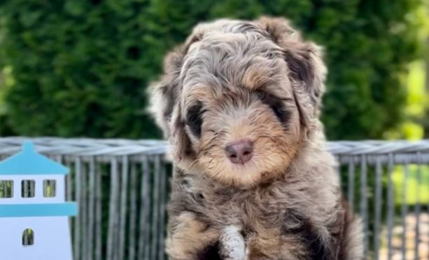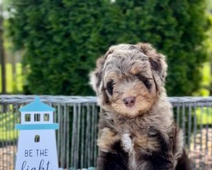 Our Bernedoodle puppies are merle. Goldendoodle puppies are apricot. Colors will vary depending on the parent dogs.