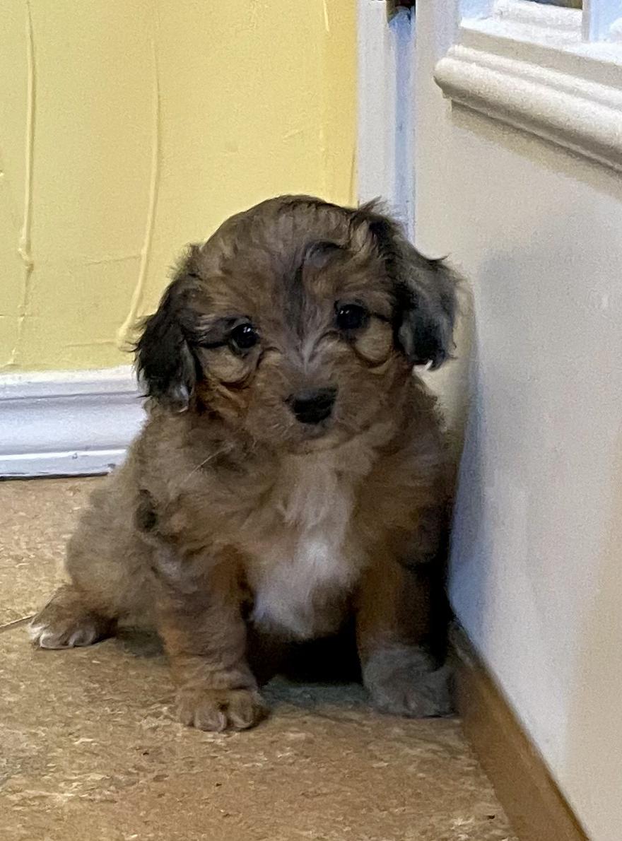 Hi - this is Cooper, the Miniature poodle. He has a wonderful temperament, loves playing fetch, cuddling on the couch, and going on adventures. He is intuitive and loyal and loves his family. Cooper is registered with AKC and clear genetic panels (via embark).