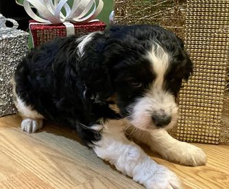 Aussiedoodle puppies include brown and white, blue merle, black and white, black tri-color, and red tri-color. Colors will vary depending on the parent dogs.