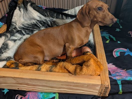 Bean is a female Dachshund. Carefully selected as a great representative of her breed, Stephani decided to make her part of their program. Stephani has passed Good Dog’s screening process, which involved a review of their breeding practices, environment, and the mental and physical health of their dogs.