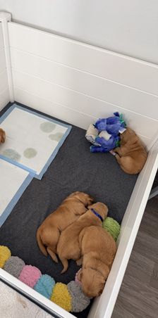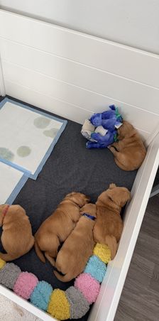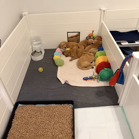 The pups got a pen expansion this last week! We have started using pine pellets in their litter box which is a great starter for getting them used to going outside, as the pine gives off a very outdoor scent. They also get access to water all the time now and are eating big kid food 3-4 times a day😊