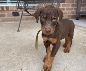 Our puppies include black and rust, blue and rust, fawn (isabella) and rust, and red and rust. Colors will vary depending on the parent dogs.