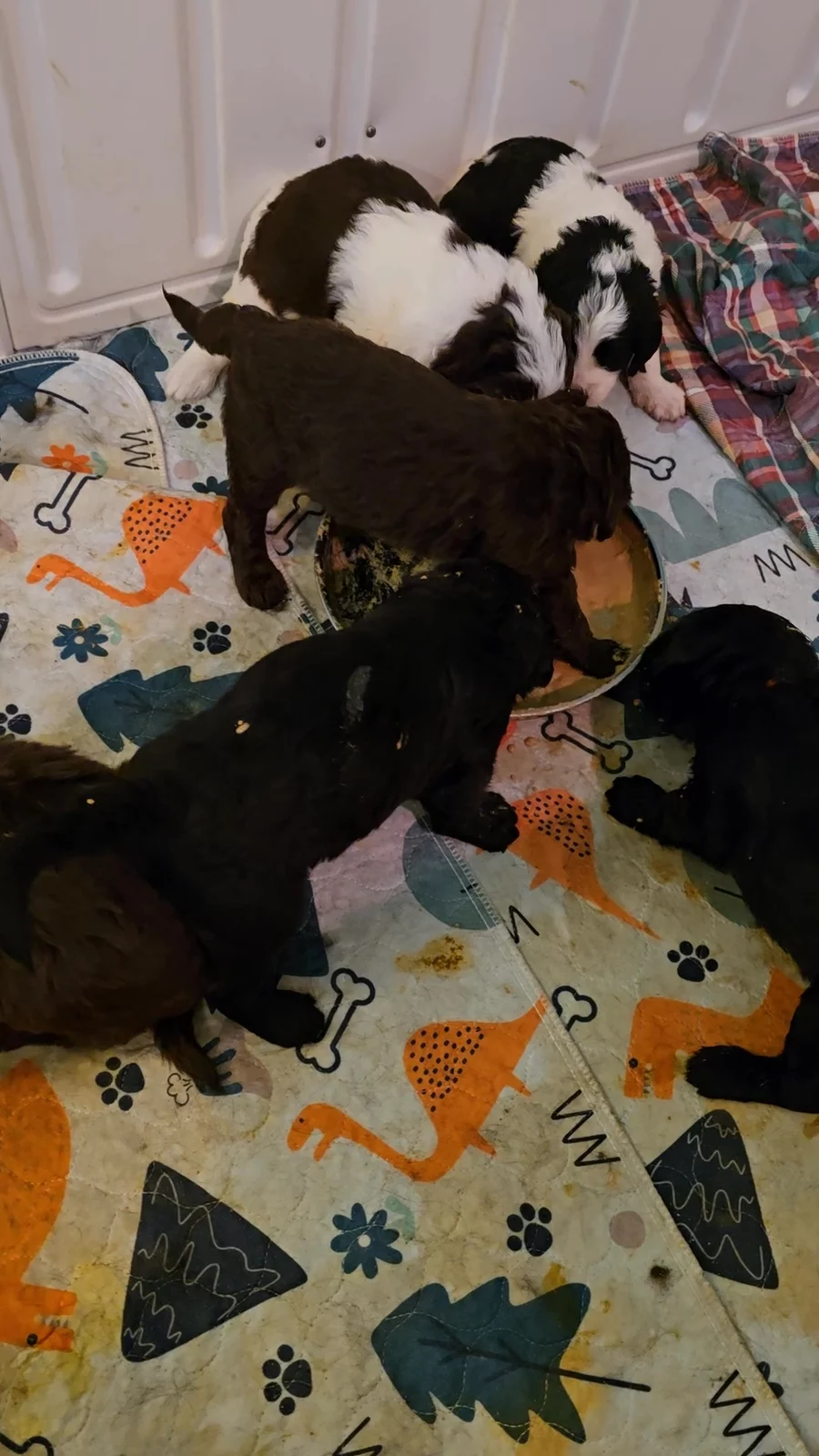 The puppies are enjoying puppy mush!! Don't mind the food all over the mats and on them- most of it got eaten!😂