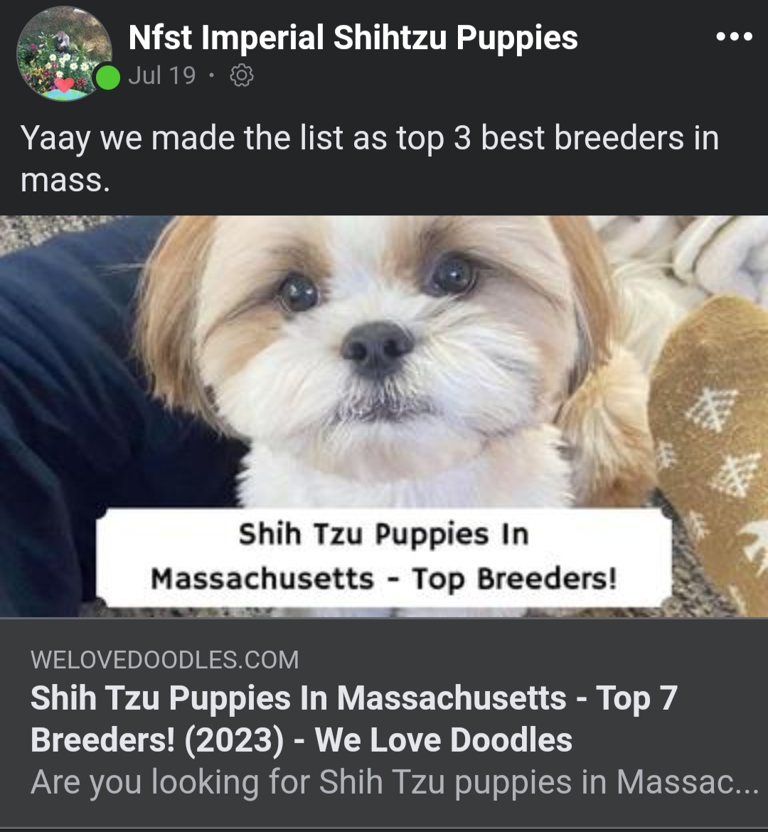 I'm Lee .., the breeder behind NFST IMPERIAL SHIHTZU PUPPIES located in Boston, MA. We have always loved all dogs, but our Shih-Tzu stole our hearts. We are members of AKC, ACA, Life's Abundance, AKC pet insurance and AKC Reunite microchips. "Life's Abundance Independent Field Representative" We do all that we can to make sure our pups get the best care and go to the best homes. Please let us know if you need to speak about payment options, we try to work with ALL families. We offer Klarna payment plans if a family chooses to use it. Continue reading about our program in the information below.