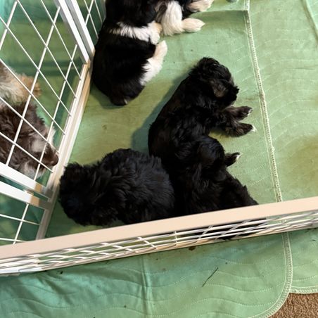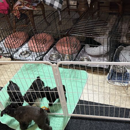 We focus on raising secure pups, exposing them to known stressful situations to develop their confidence. We get them used to going potty outside early. Puppy package includes: Crate & bed Water & food bowls Chew toys Blanky, with Mama & littermates scents Snuggle toy PeePads Ampul puppy food We provide the necessities so they can spend time bonding.