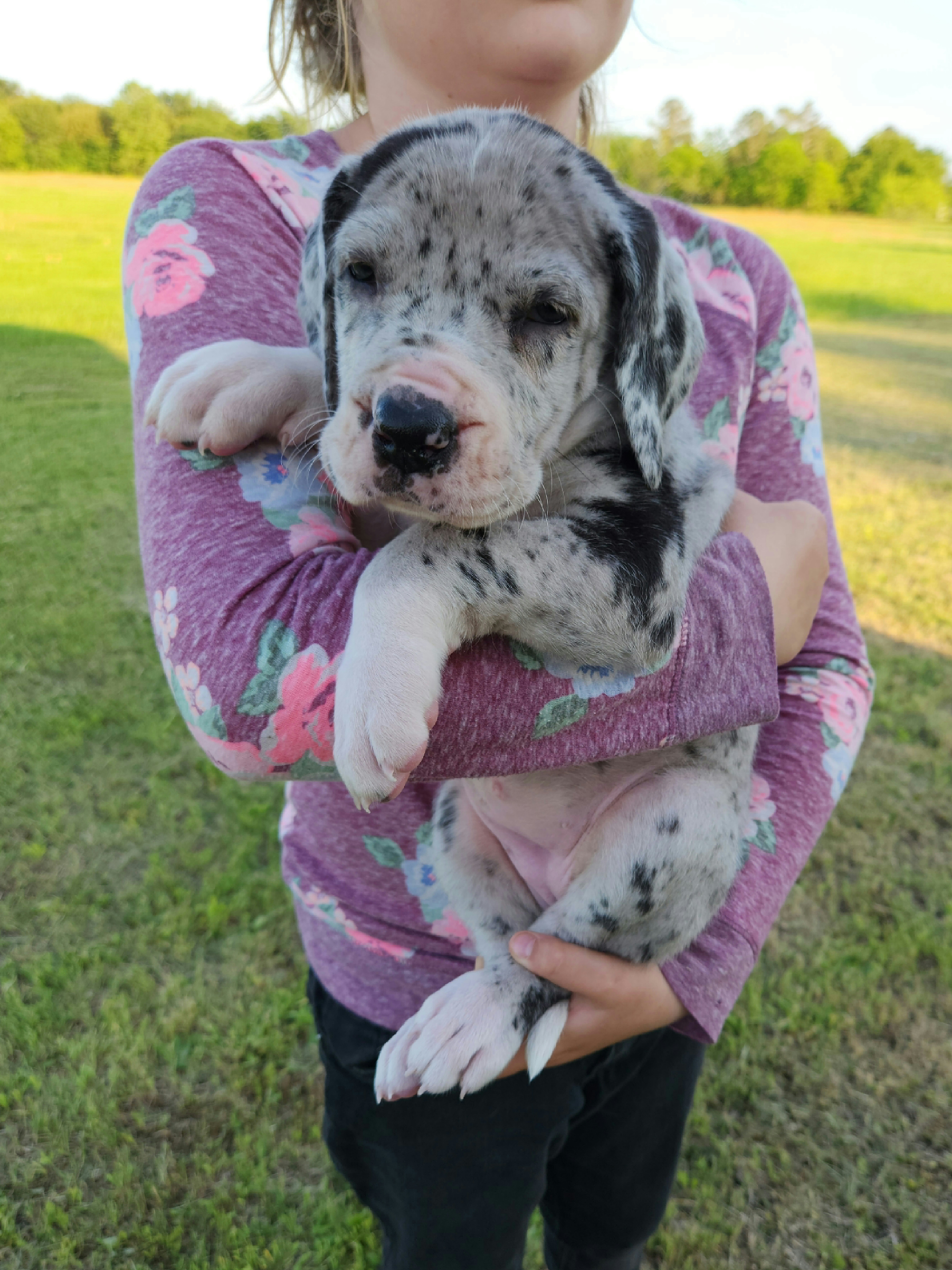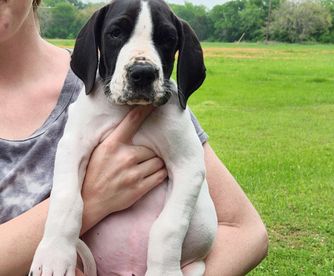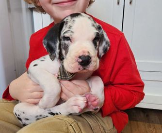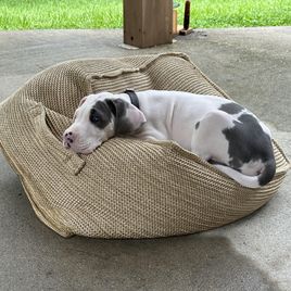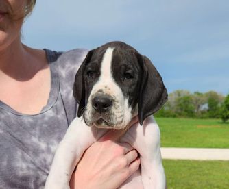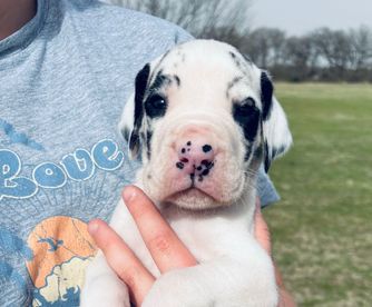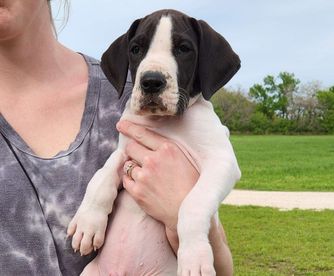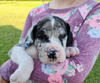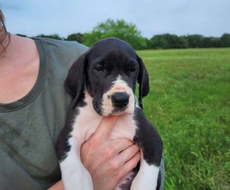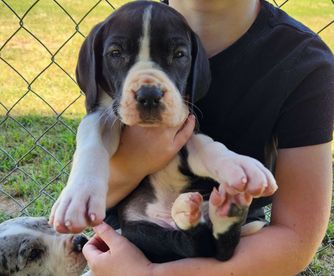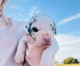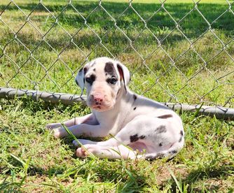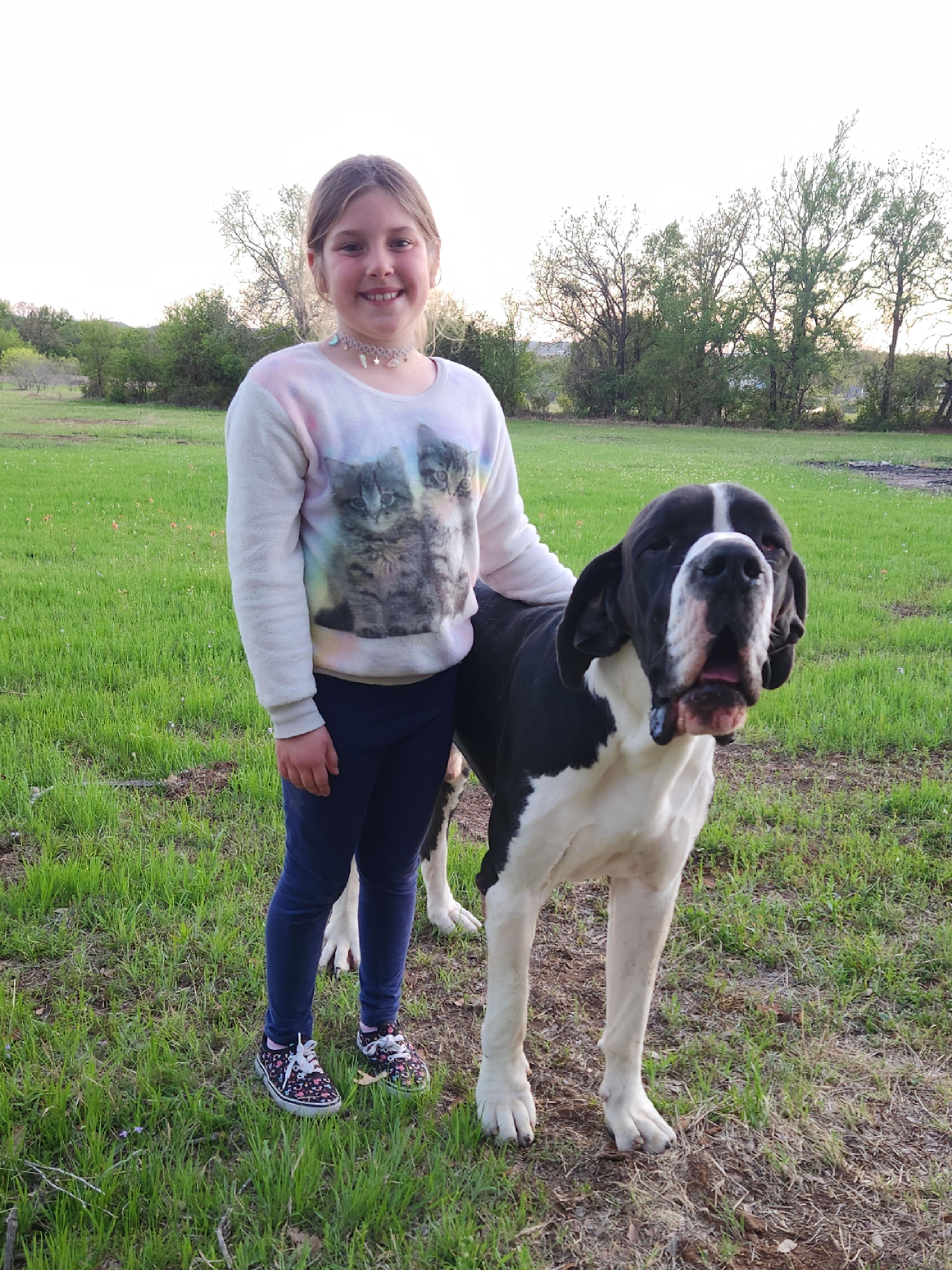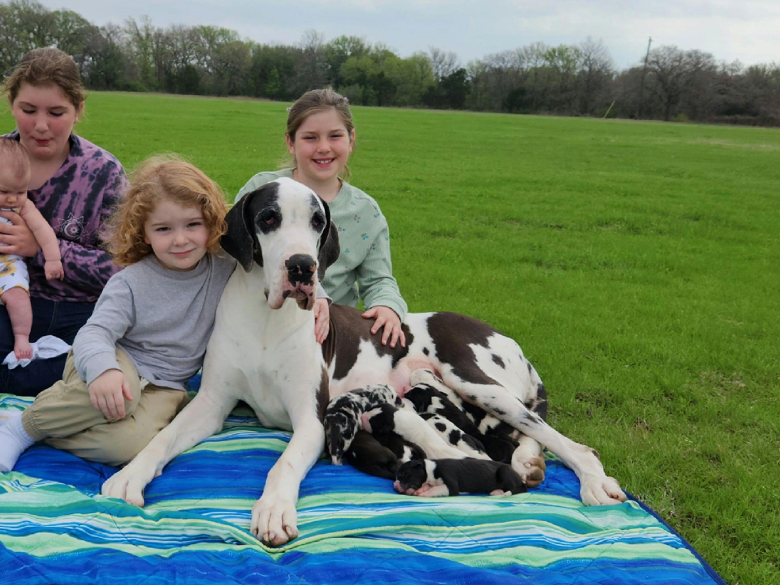 I'm Megan C., the breeder behind Nick and Megan's Danes located in Cleburne, TX. Our dogs are bred to have all of the qualties desired in the Great Dane Breed so that they will be the perfect pet for your family. We follow the AKC requirements for approved color breeding and health test all of our Danes. Our Dams and Sire are carefully chosen to promote loving and gentle temperaments. We have 5 children and we live on 26 acres in Cleburne, Texas. We raise our Danes as a family and dedicate our time and love to raise happy, healthy puppies. We begin potty training at 5 weeks old. Puppies come home with 2 year genetic health guarantee and AKC registration. They are dewormed at 3, 5, 7 weeks old and come home up-to-date on vaccinations.