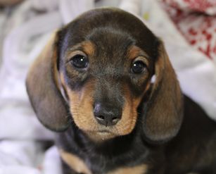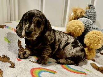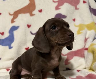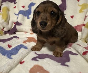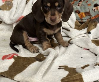 Daisy is a clack and tan, short haired miniature dachshund. She is AKC registered, as well as health and genetically tested! Daisy is a love bug, she wants nothing more than to be in your lap! She is such a wonderful mama, takes such good care of her babies. Her favorite things to do are be outside napping in the sun and running around.