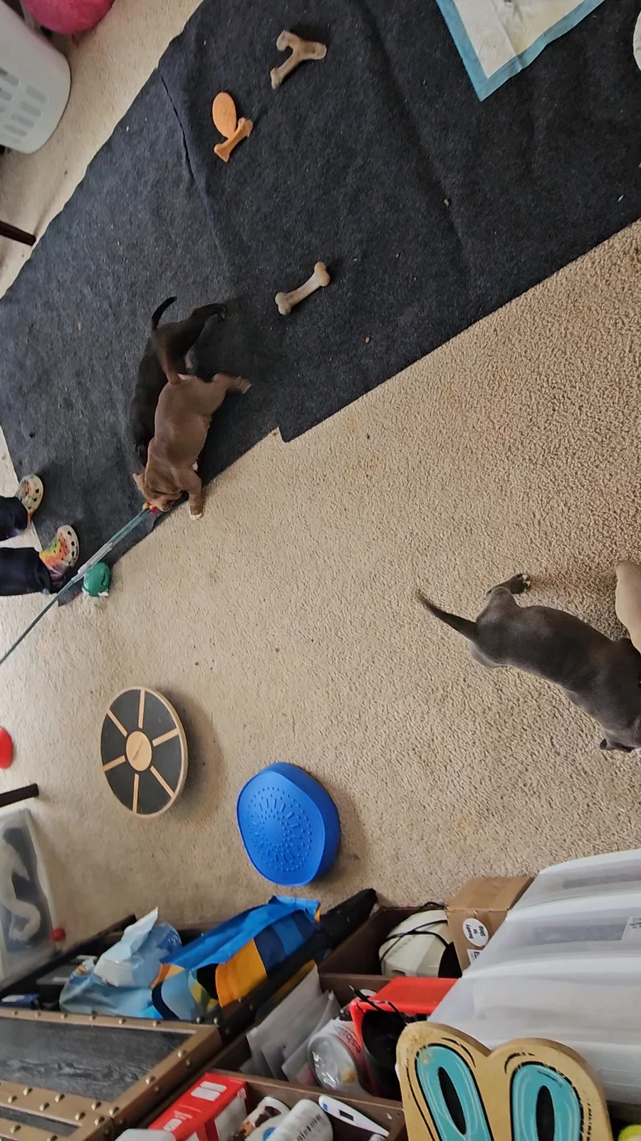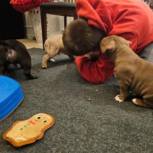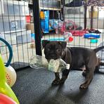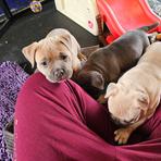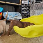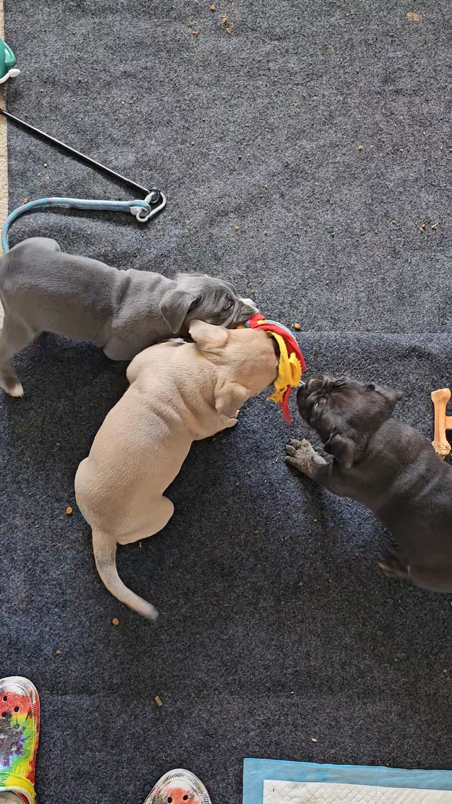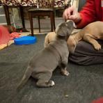 When I started looking for an American Bully breeder my first concern was health and temperament, and then how cute the pups were. I had never considered that I wouldn’t be the one to actually choose my dog when I messaged Night Court Bullies about their upcoming litter. At first it made me nervous and then after hearing about all of the temperament testing and Avidog protocols - excitement was the only emotion I had left! I made a deposit pretty early so Freyja (the cutest mama dog ever) hadn’t even gone into the heat cycle they would breed her during. The anticipation was such a rollercoaster of emotions! When I finally heard that she was indeed expecting puppies my heart all but melted. When the pups were born I knew immediately that I would be happy with any pick from the litter. They were all healthy and gorgeous. Working with Night Court Bullies is like playing the lottery except you KNOW you’re going to win big no matter what - and that’s exactly what happened. I’m so happy with the pick they made for me (blue collar) Bruce is perfect. It’s like I have known this little lover boy for my whole life. He is the cutest and smartest little velvet hippo! Picking him up and bringing him home was made so much easier by all the support that Night Court Bullies provided through their “take home bag” and their continued support through text and phone. They really are all in sort of people, the best kind! So excited to bring him to work with me and socialize him with all of my friends, family, and their animals too. They gave me the best “go anywhere” dog of the litter. I will definitely be coming back to this breeder when I eventually want to add another family member.