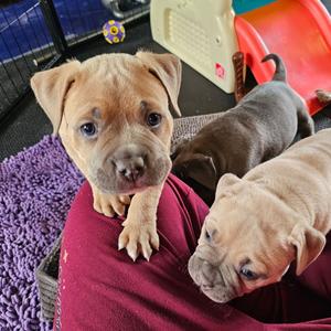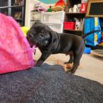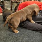 I have to admit, when I was looking at this site, I was on a rebound because my best friend of 16 years just passed away.I was surprised how everything has changed since I got Beastie when he was a pup. Everything was local back then, as you could visit and see the puppy you desired in person. Nowadays, and with a site like this, you can pick your pup anywhere in the country, which gives you more choice! On the other hand, you're walking on a minefield because this opened up a whole new door to all sorts of breeders. I was looking for a new companion with a temperament similar to my old friend. I contacted a few breeders after seeing their puppies. Their responses varied, but the overall tone was more businesslike as if these pups were being sold just to make money. I did not like that at all. When I came upon Night Court Bullies puppies, I sent a message to the breeder. What got my attention was Daniel's response: "I couldn’t promise you a particular dog. I can promise you the right dog for you though. And I can promise it will be healthy with a great temperament." I thought it was a rather novel approach, but it piqued my interest. After some back and forth, and interviews, I think I found the right breeder! Daniel and Korinne were more than happy to answer my questions. No sugar coating, just straight up to the point. They're very transparent about how the puppies were raised. I was able to see them daily even though I'm 9 hours away. I could see how these puppies were being brought up. They were raised in a very clean environment and you could see that Daniel and Korinne are very passionate about their dogs. To see the puppies from their crawling stage to the first time being outdoors, introduction to the older doggies, special party for their socialization, first trip to Rural King, and seeing the puppies' reactions to different sounds, their adventures in the yard, etc. it was amazing. I felt like I was with my puppy every step of the way so much so that when I finally held him in my arms, I felt like I'd known him for a while. The puppy I ended up with is very intelligent, great temperament, is healthy, and is pretty much adventurous. I think I luck out in coming across Daniel and Korinne. Not only did I gain a wonderful, new companion, I also made a couple of wonderful friends! Without a doubt, I highly recommend Night Court Bullies.