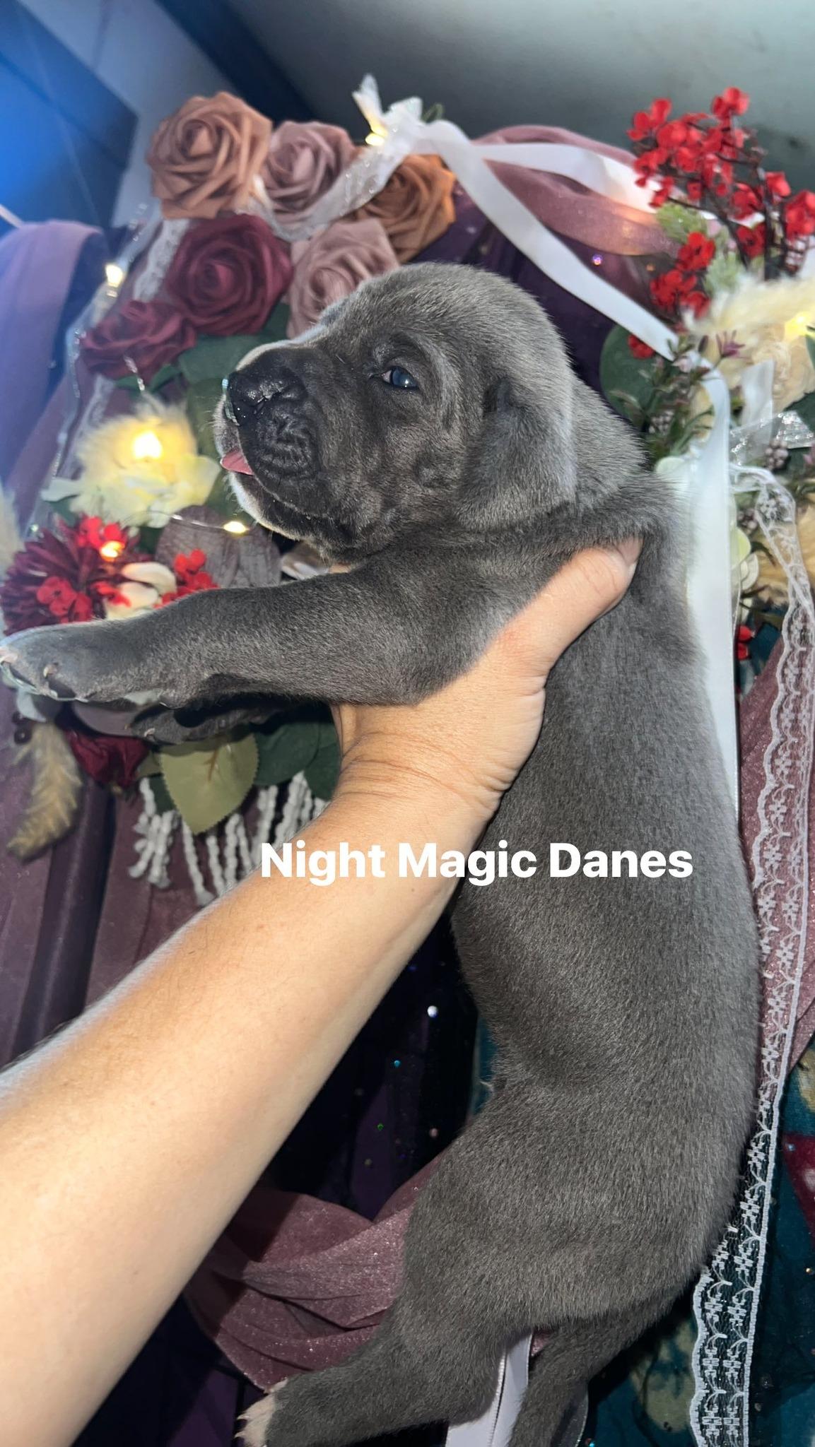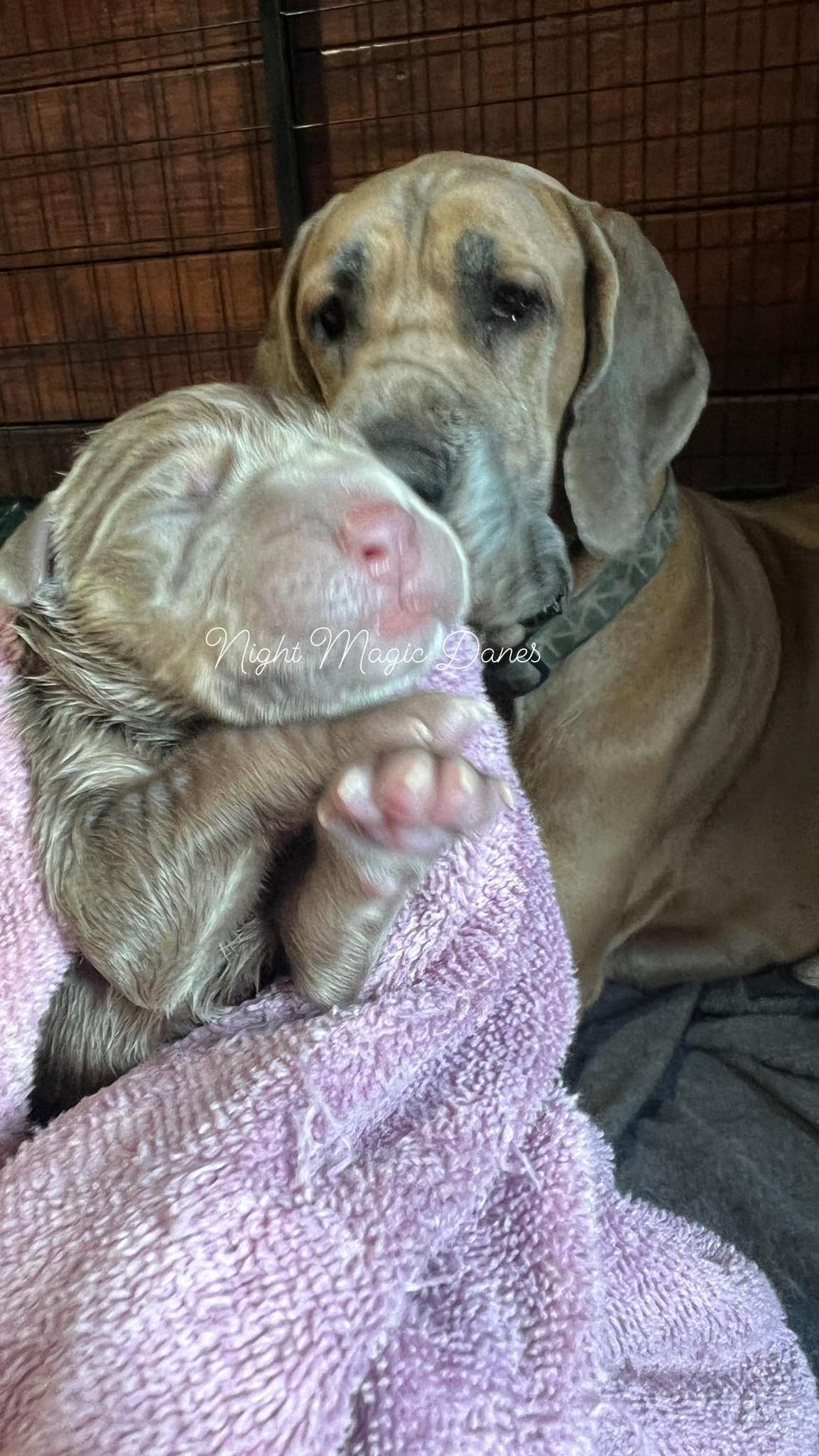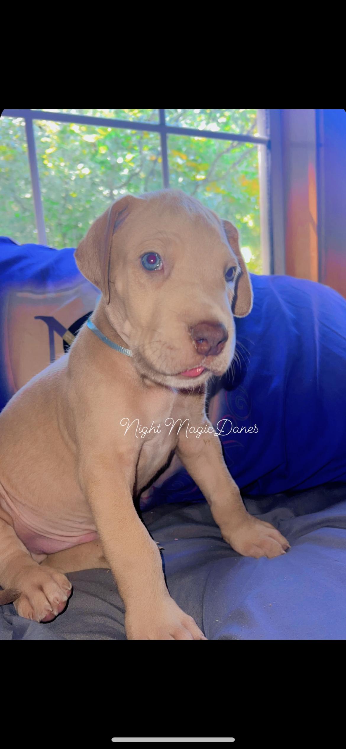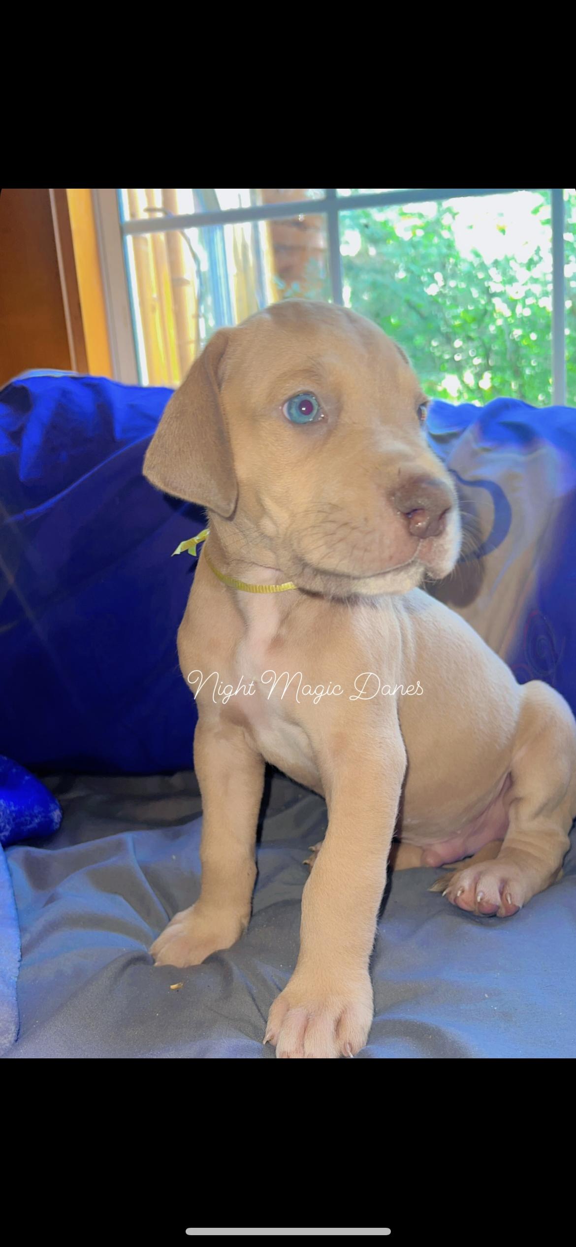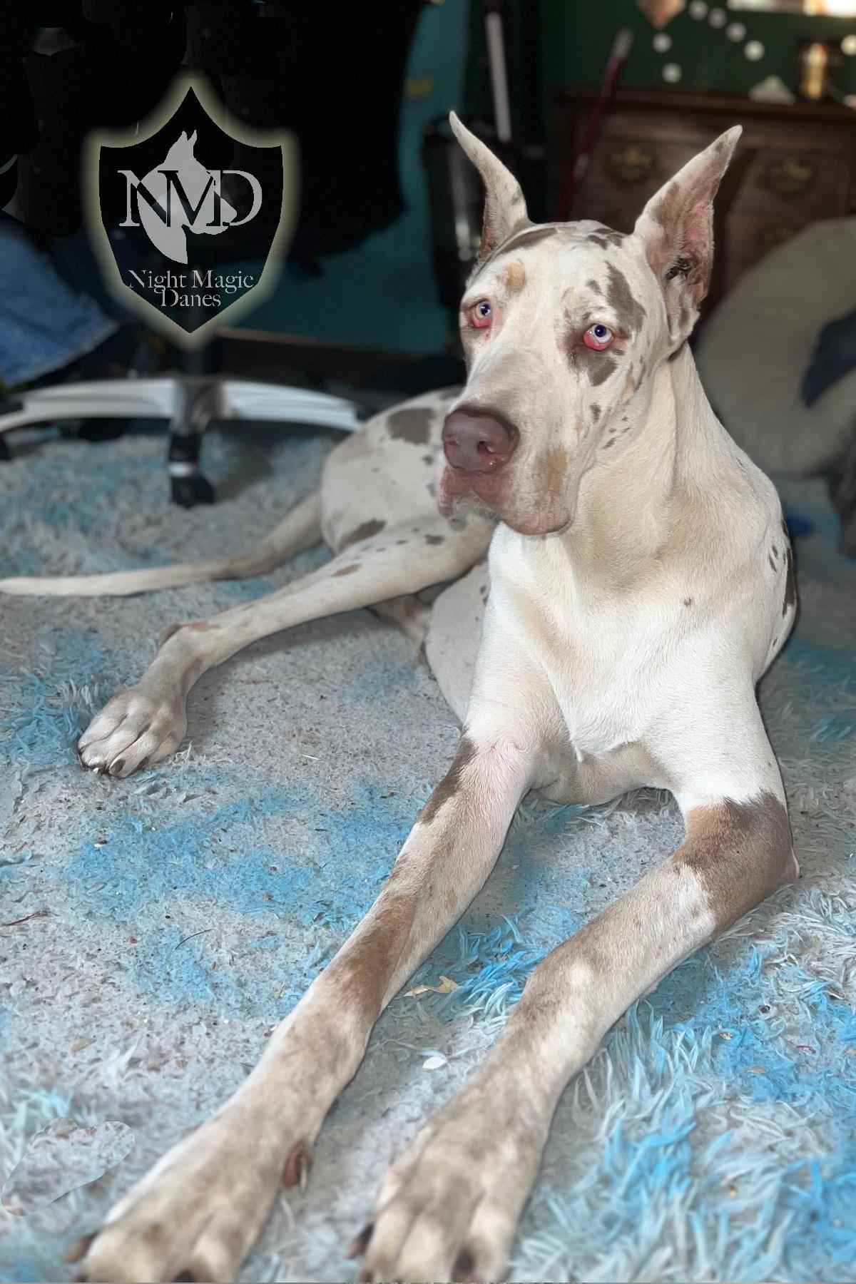 I'm Ann S., the breeder behind Night Magic Danes located in Georgia. Pups are raised underfoot & are started with early learning lessons at just 4 weeks old and by 8 week are mark trained to sit and wait for food as well as being fully potty training to a puppy door. Many of our pups go on to be therapy/service dogs because of this.. so don't miss out 229/224/2591.