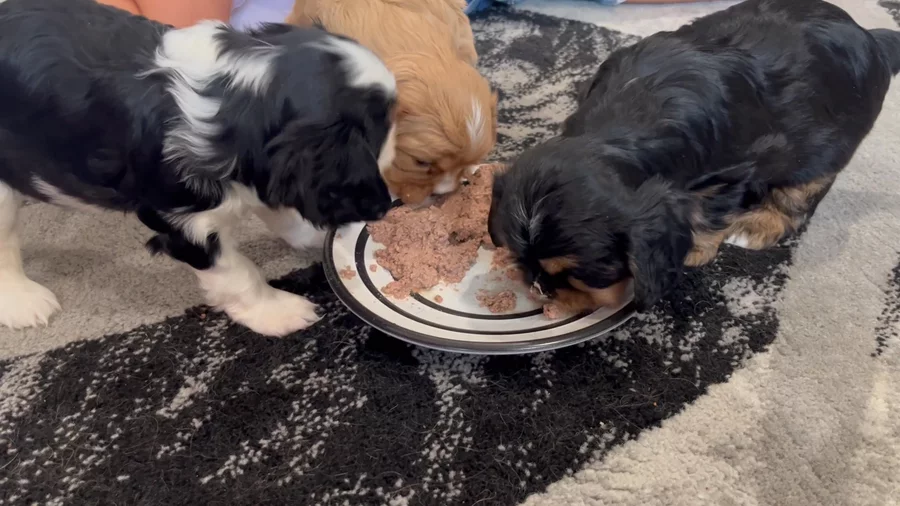 At four weeks old, my puppies start weaning onto puppy food. They’re introduced to the outside to walk on grass and go to the bathroom outside. They’re taken out multiple times a day for potty breaks and for playtime. They are socialized with children and other dogs, and introduced to loud sounds like the vacuum cleaner, and things like that.