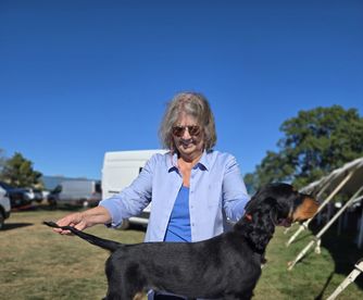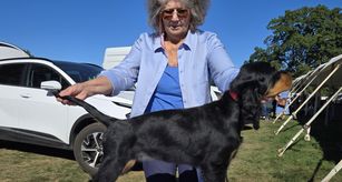 My second Gordon was a bitch, Nimue, also purchased from Fran Glynn. Fran mentored me through breeding. This simple gesture by Fran, and meeting breeders on Long Island, who invited me to attend their bitch's whelp evolved into my becoming a doggie midwife on Long Island for other breeders, (Newfoundlands, English Setters, Norwegian Elkhounds)