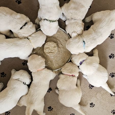 Week 3 update. Lots and lots of developments happening. The puppies ears opened, they are walking. Recently heard a bark and puppies starting to play with each other. Due to size of litter we stated puppy mush a little earlier. Today was day one.