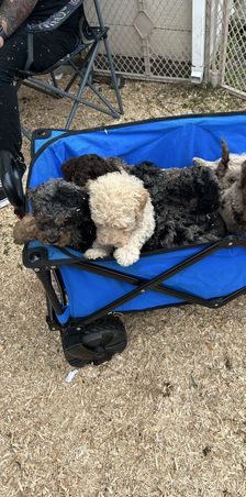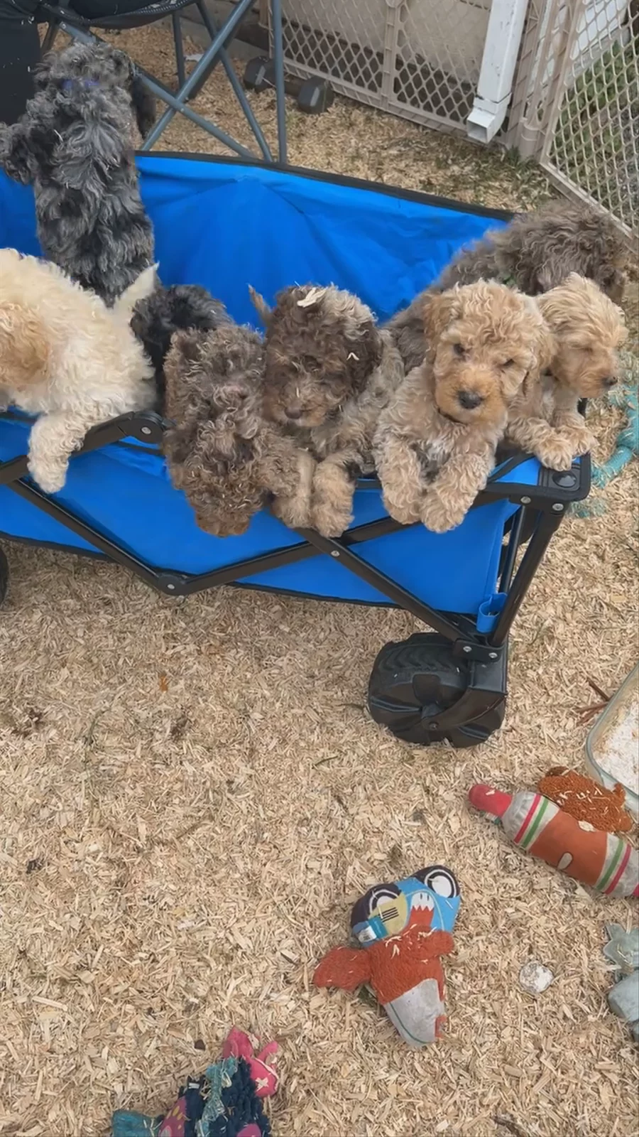 Our puppies include cream, chocolate, black, phantom, merle, and parti. Colors will vary depending on the parent dogs.