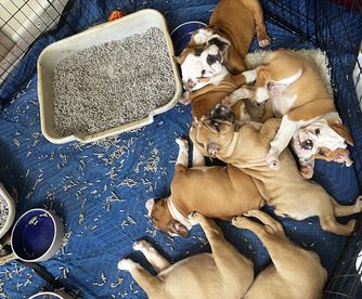 Our EBs receive lots of love and care. We do everything we can to keep our girls happy and comfortable. The puppies go into an incubator and I get up every 2 hours to feed and care for babies and momma. We are very hands-on with raising the babies in the middle of our home, even litter pan trading them.