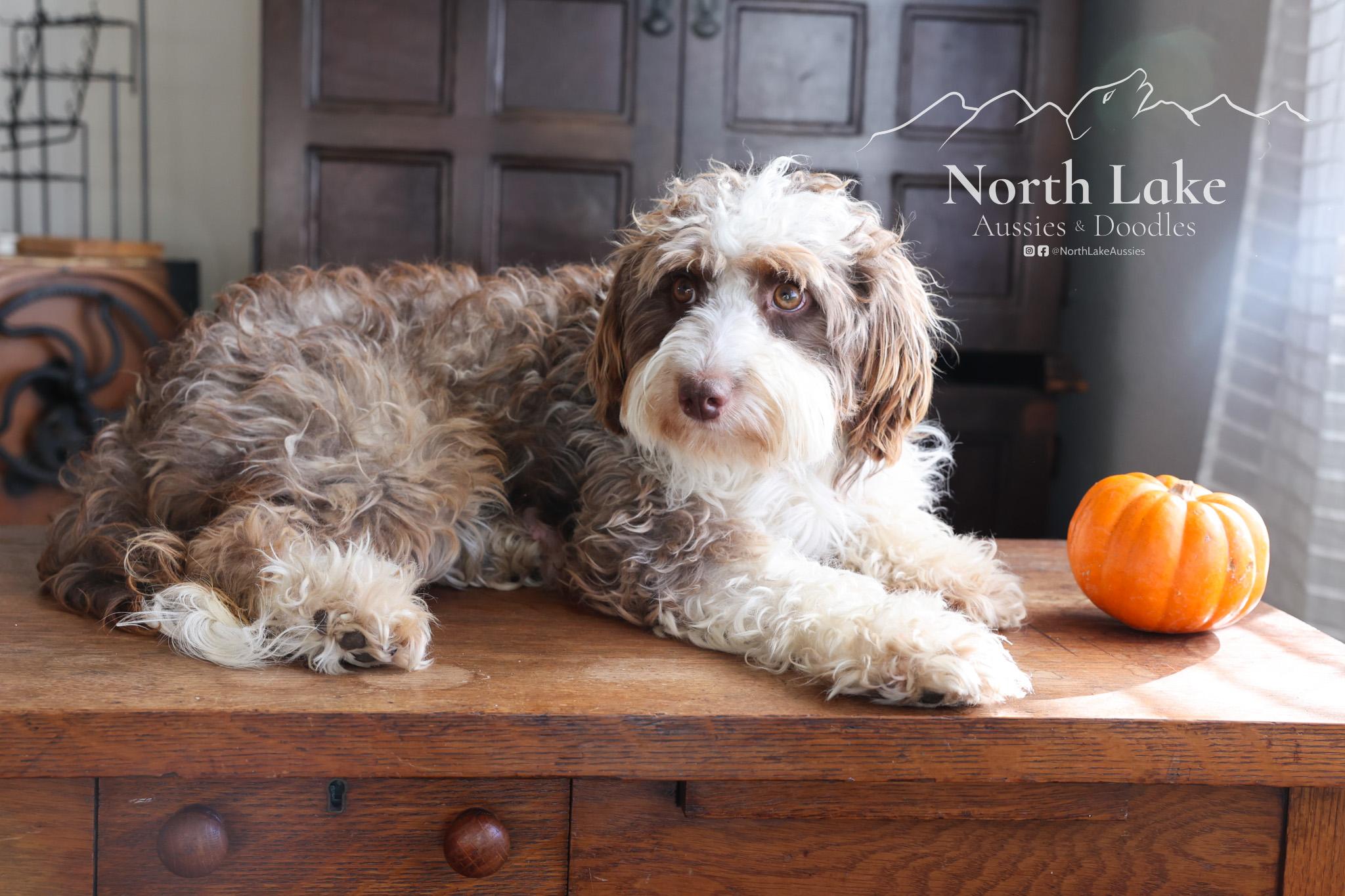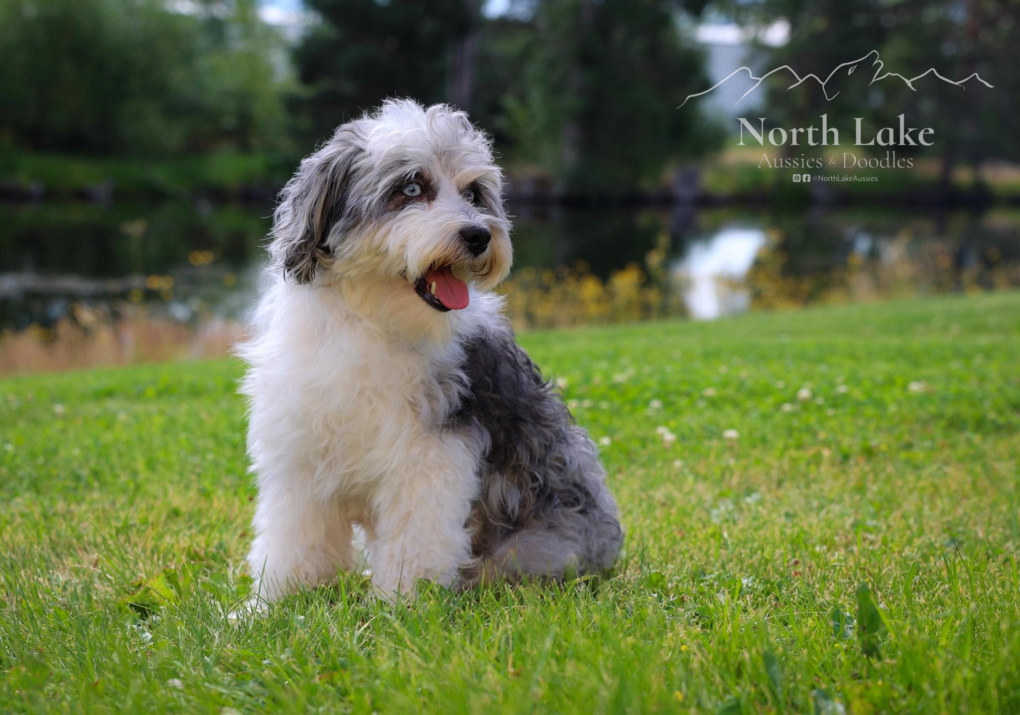 Stewy is an an F2 fully furnished Aussiedoodle. What this means is that all of his pups will have that cute face hair that makes the pups look like Teddy Bears. We are super excited to have him in our program as this allows us to breed pups that are higher percent Mini Australian Shepherd than Mini Poodle while still allowing the pups to have the adorable look of an Aussiedoodle.